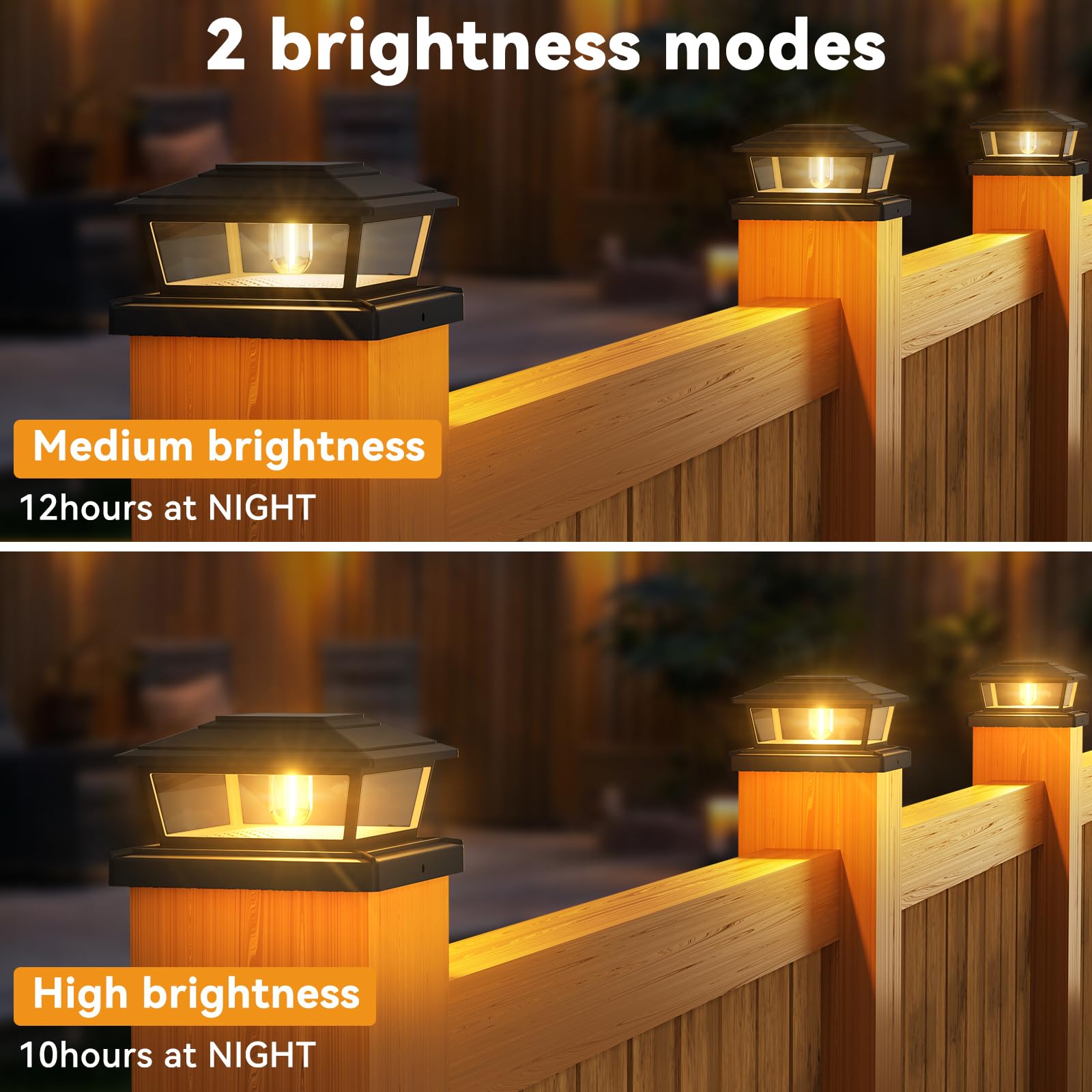 - 2 Lighting Modes: btfarm 4x4 solar post caps lights feature 2 lighting modes that emit 15-30 lumens of warm white light; slide the switch below the solar panel to select the mode. Medium mode emits 15 lumens of warm white light and lasts over 12 hours on a full charge; high mode emits 30 lumens of warm white light and lasts over 10 hours on a full charge