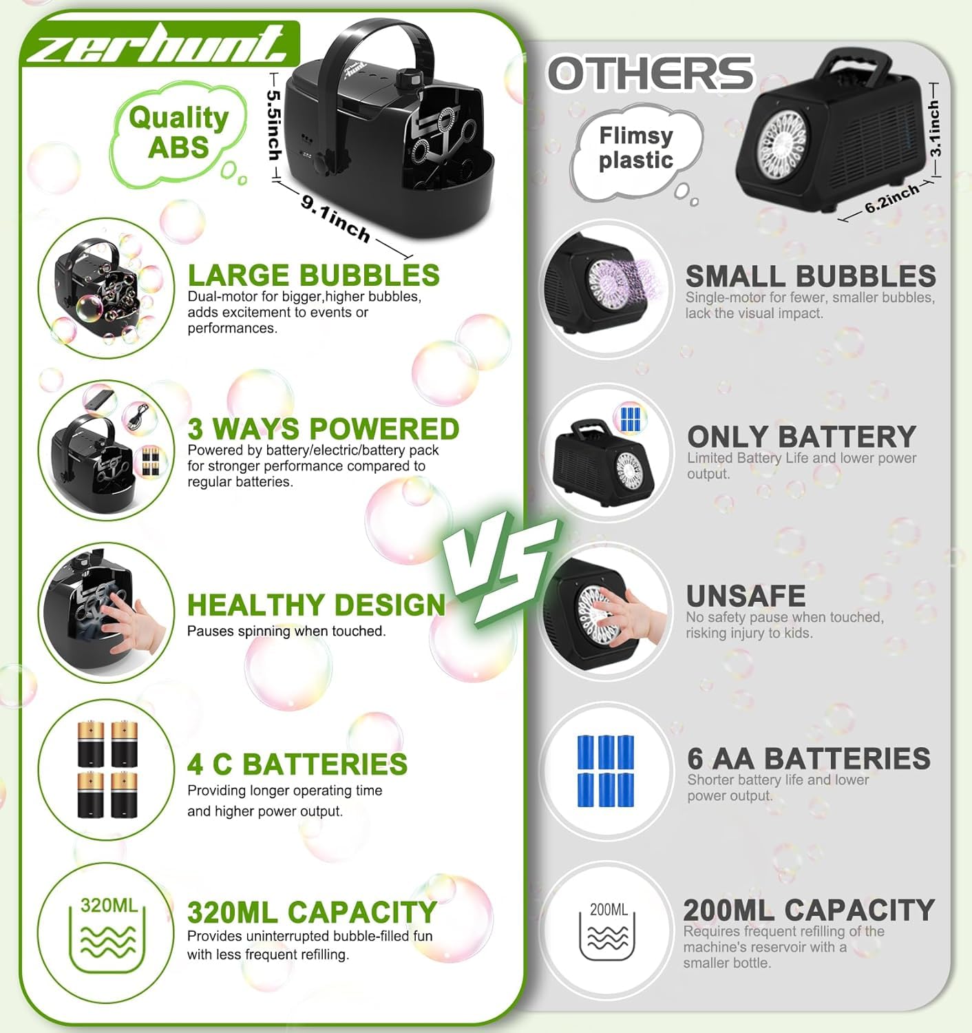 - 【High Output 18000+ Big Colorful Bubbles】2023 Upgraded Zerhunt Bubble Machine Can Generate More Than 18000+ Bubbles Per Minute With 6 Spinning Wands,2 Speed Level & Super Built-In Motor. It Can Blow Tons of Colorful Bubbles Faster, Higher And Further Even Inside With No Wind.