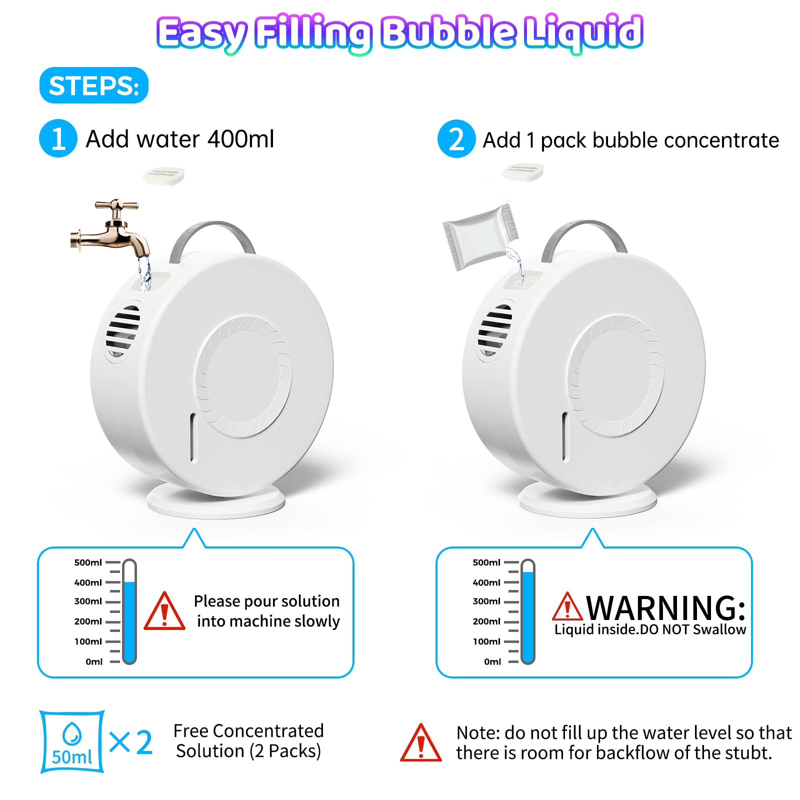 - Removeable Water Tank and Free 2 packs bubble solution : You can remove it and add bubble liquid directly to the water tank, the operation is simpler, can completely the bubble liquid out without wasting every drop of bubble liquid. It is easy to clean the water tank.You can remove, and clean it totally. Tip: It is better to add 50ml concentrated bubble soap & 450ml water. And need to shake the solution before use. Then you will gets plenty of bubbles. We provide 2 of 50ml bubble concentrate.