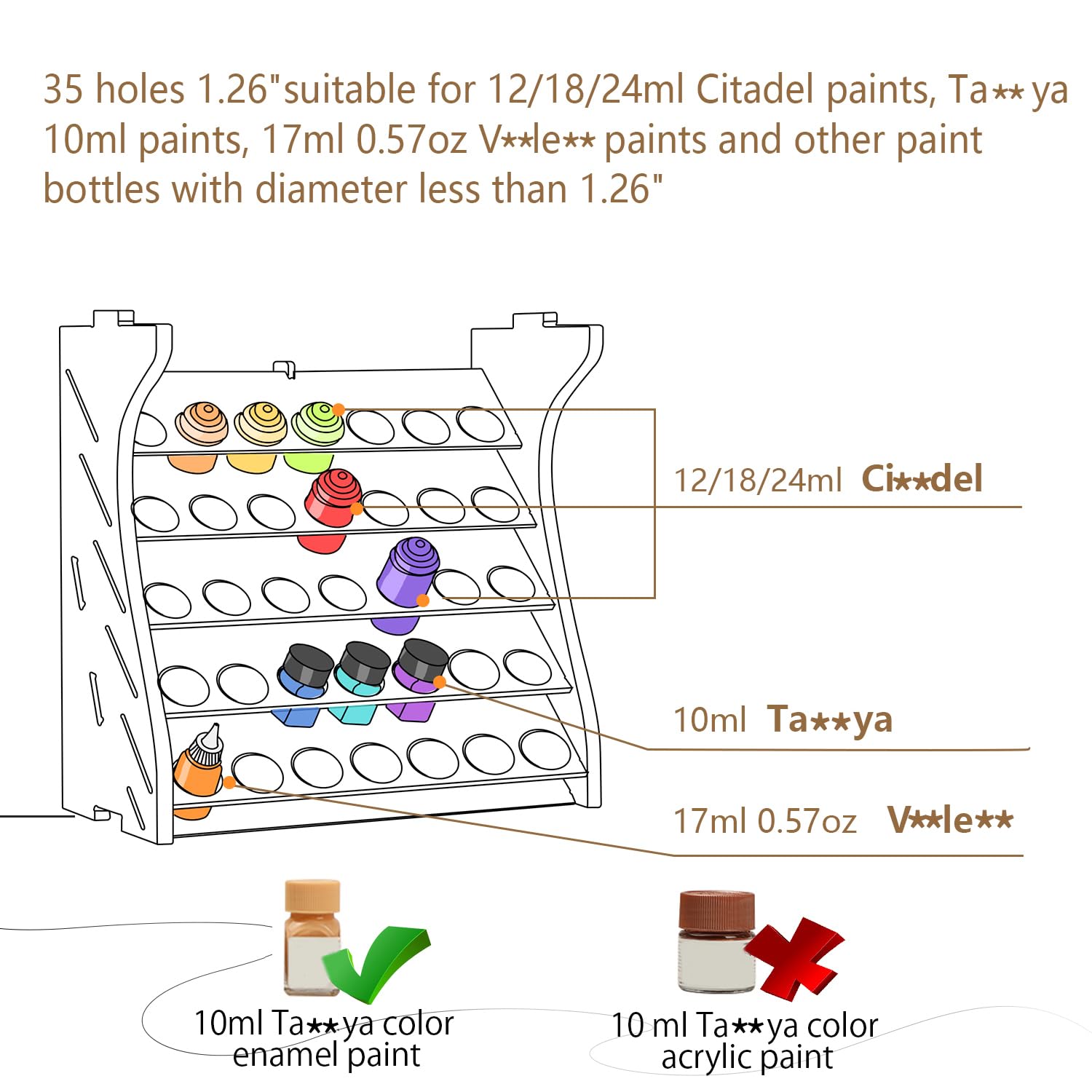 - Strong Compatibility--GK11 paint organizer contains 35 holes with a diameter of about 1.26 inches, compatible with 10ml TAMIYA COLOR ENAMEL PAINT, 17ml Vallejo paint, 12/18/24ml Citadel paint and other brands paint. Universal sized holes are ideal so you can keep all your paint in one place for practicality. The laconic design adorns your art workstation and keeps it more organized. Note: 10ml TAMIYA COLOR ACRYLIC PAINT (round bottle) is not suitable.