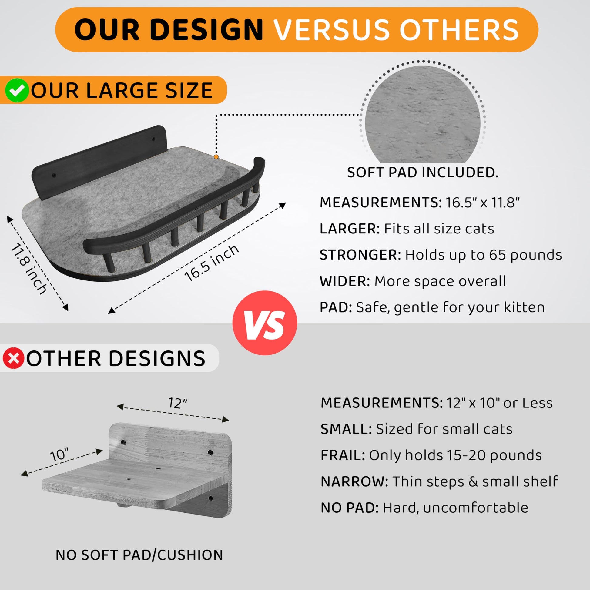 - PREMIUM HARDWOOD & HEAVY DUTY SUPPORT – This wall-mounted set includes 3 steps and 1 cat bed, crafted from top-quality wood and built to support up to 65 lbs, ideal for large cats. The smooth finish and plush elements provide comfort while encouraging active play and exploration.