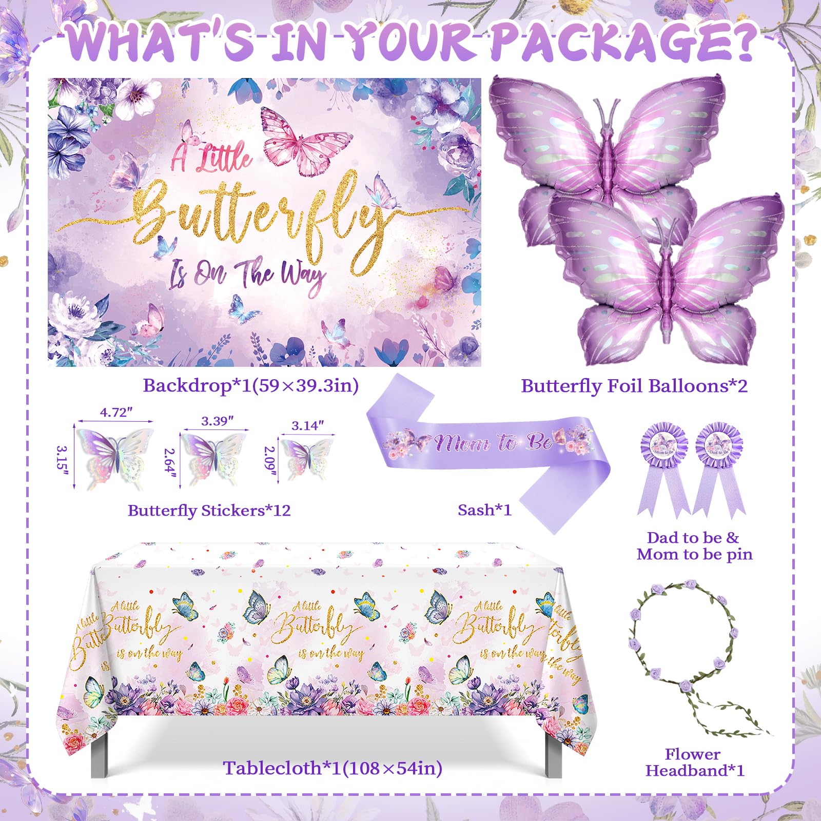 - Butterfly Baby Shower Decorations for Girls: Include 112 pcs pink purple balloons, A Little Butterfly is On The Way backdrop, sweet baby girl banner, tablecloth, "Mom to Be" Sash and pin,"Dad to Be"pin, flower crown, cake topper, 12 cupcake toppers, 12 butterfly stickers, 2 butterfly foil balloons, 1 set OH BABY foil balloon, 4 baby boxes and balloon tools, the package includes all you need to throw a baby shower party, saving you the time and hassle of buying everything separately
