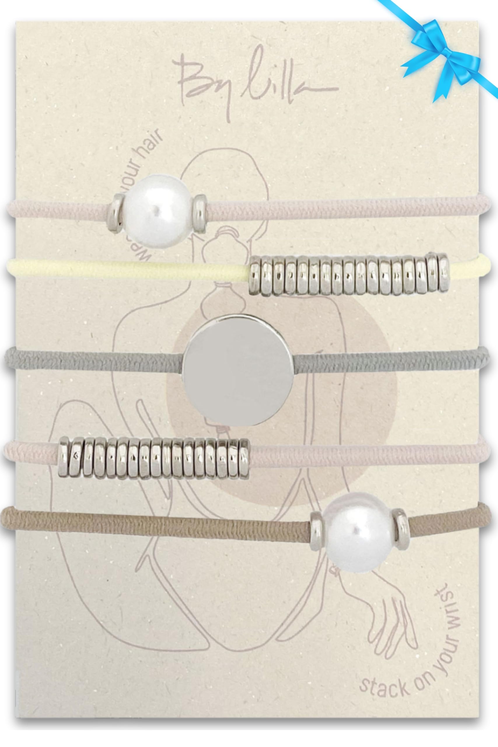 By Lilla Tulip Mini Stack Elastic Hair Ties and Bracelets | Set of 5 Hair Tie-Bracelets | Hair Accessories for Women | No Crease Hair Ties & Women’s Bracelets (White Pearl / Pink / Yellow / Gray / Nude)