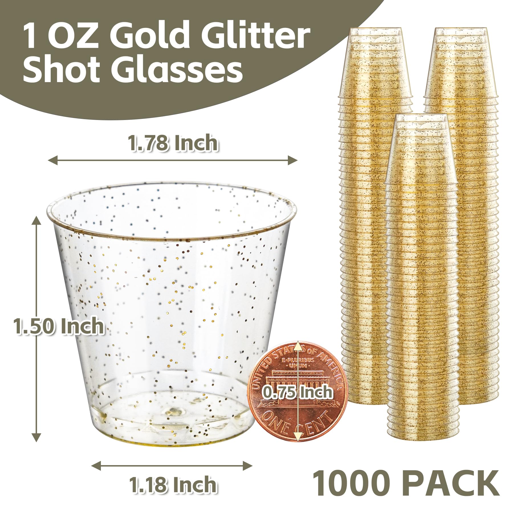 Byvivace [1000 Pack 1oz Shot Glasses Disposable Cups, Gold Glitter Plastic Shot Glasses for Sauces & Dips, Shot Cups Ideal for Tequila, Whiskey, Wine Tasting, Vodka & Liquor