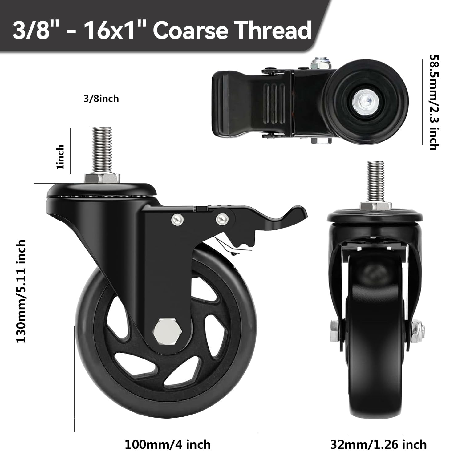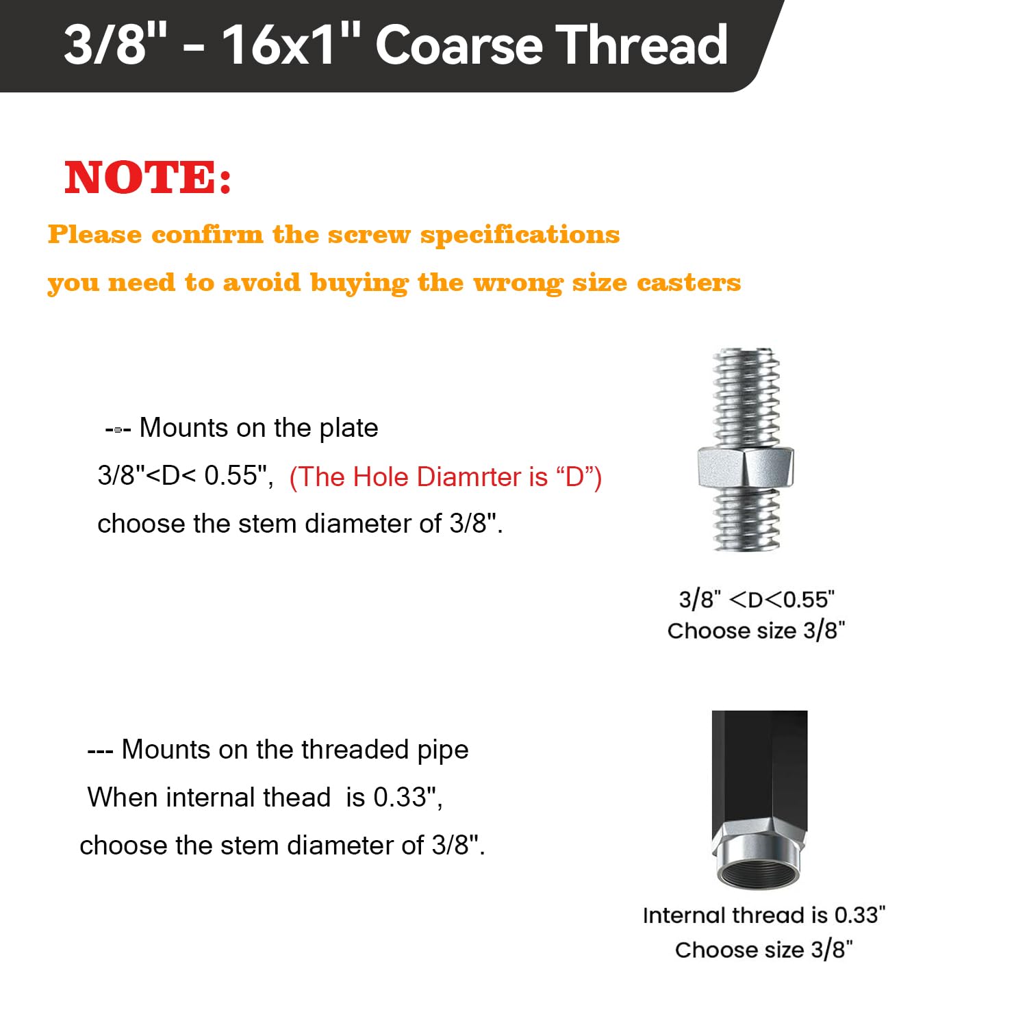 - SCREW ROD SPECIFICATION: Please carefully measure the stem size and confirm the required screw size to avoid wrong purchasing. Our stem casters wheels screw size is 3/8" -16x1" (Screw Diameter 3/8", Screw Length 1") As long as the size fits, caster wheels will provide a solid and efficient solution for your work.
