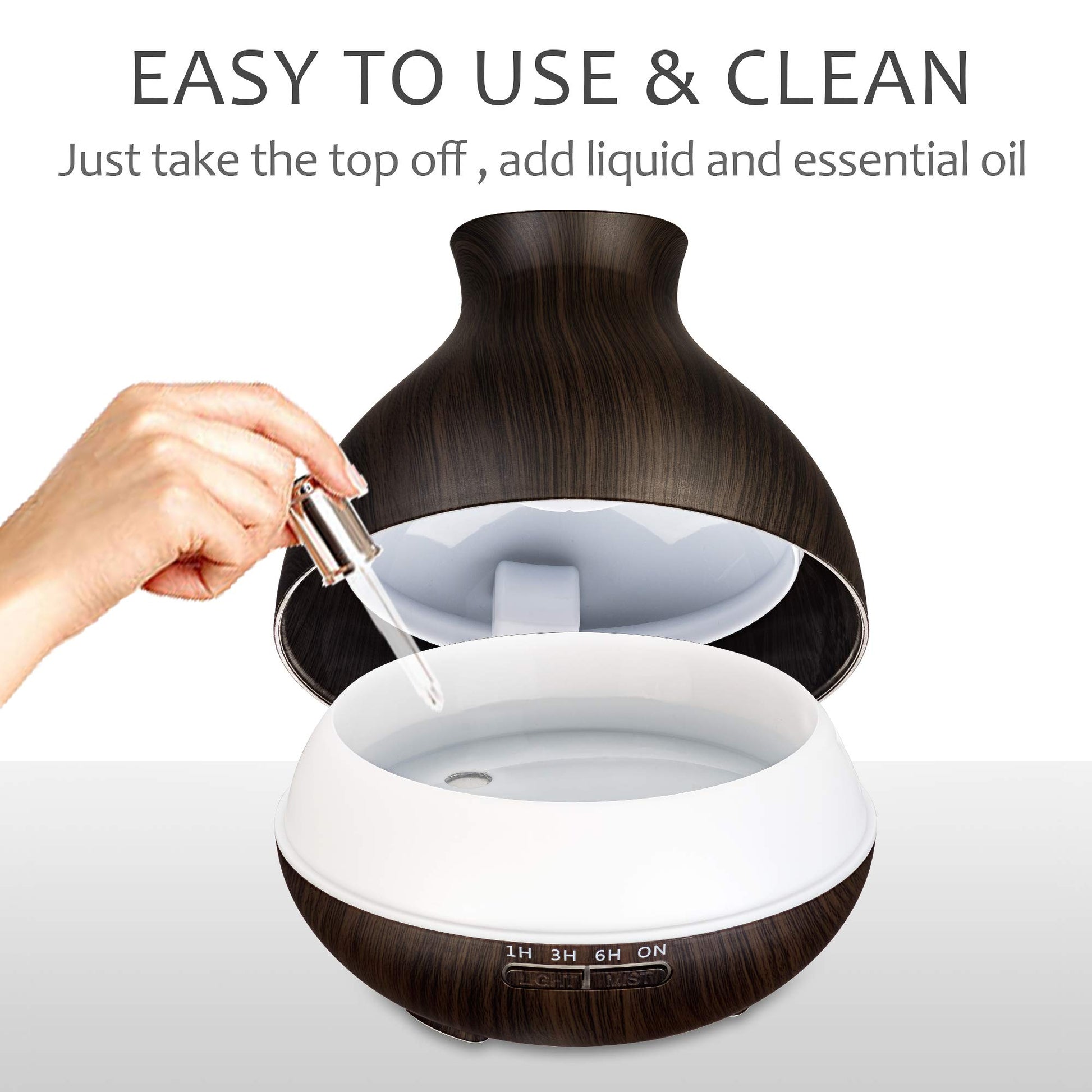- SLEEK and ELEGANT LOOKING, 8 COLORS: The aromatherapy essential oil diffuser is made of plastic with a faux wood look, BPA-Free water tank, fine design, and good quality, it blends naturally with the most home decor. The changeable colored lights bring an elegant view, create a relaxing atmosphere to the room, and make your life more colorful.