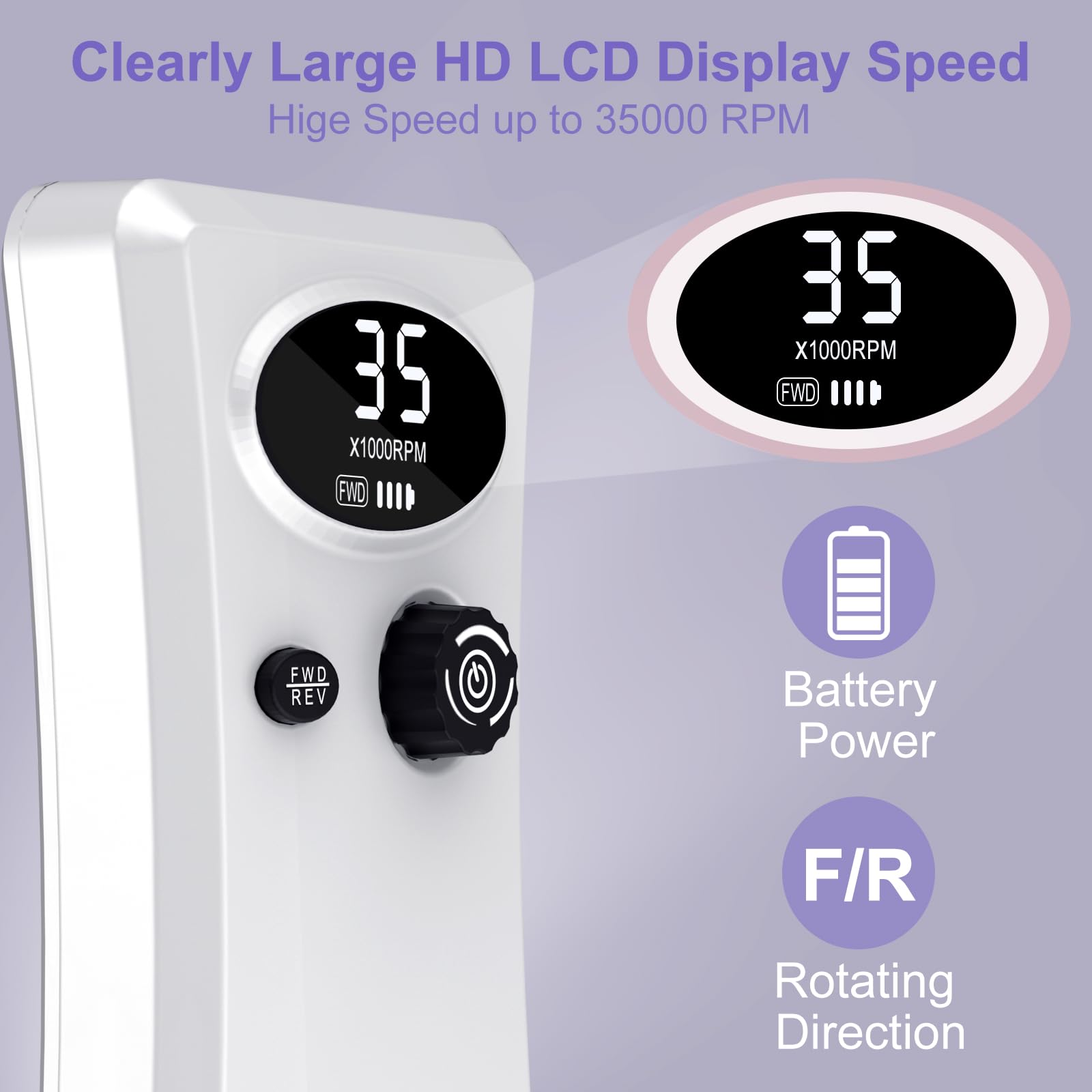 - 【35000 RPM Adjustable High-Speed Bearings】: 0-35,000RPM Nail Drill with a turning knob and LED screen that displays remain battery. Prehand and reverse direction freely selectable (F/R), suitable for left and right-handed. With a high -quality engine and chip, the milling cutter is always stable and low in vibration.