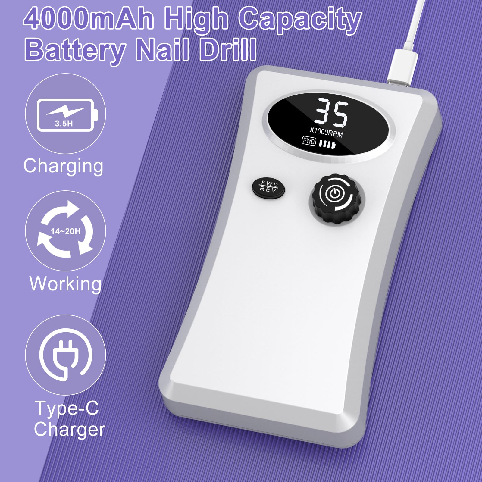 - 【Rechargeable Nail Drill Bits】This rechargeable electric nail file machine, comes with a large capacity battery 4000mAh, which charges for about 3.5 hours, can be used for up to 12 hours. The professional nail drill is equipped with a delicate lock drill, which has high compatibility and concentricity, so you don't have to worry about about the nail drill bit falling off.