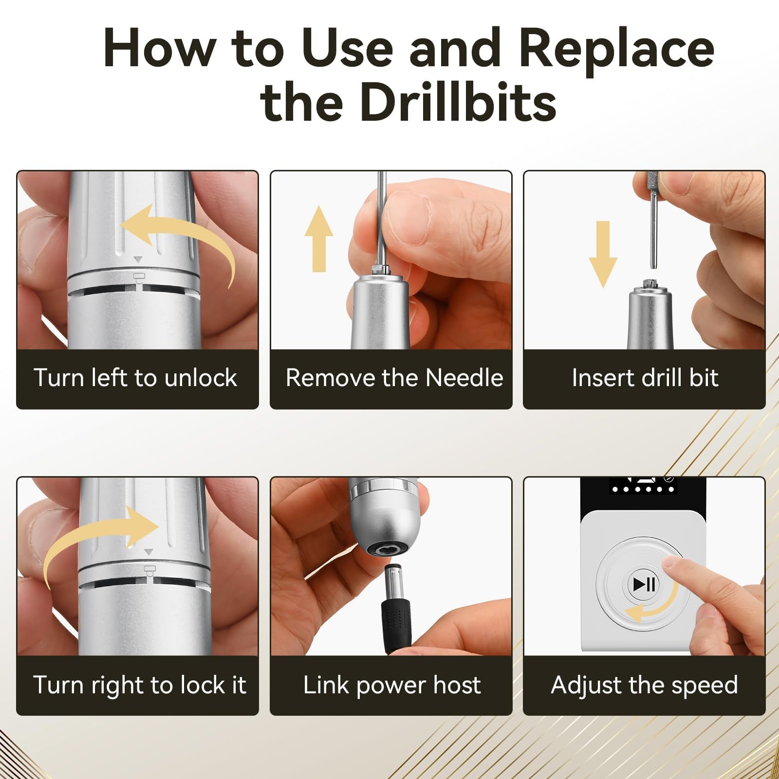 - Low Heat/Low Noise/Low Vibration:Nail drill kit with quality aluminum alloy handle, and made up of powerful yet quiet torque with smart heat dissipation and low vibration, comfortable to grip in hand, twists lock system makes it easy to change nail drill bits, this nail drill machine provides you a safe and effective nail art experience. Great electric nail filer for both professional nail salon use and DIY your nails at home, enjoy nail beauty with your friends