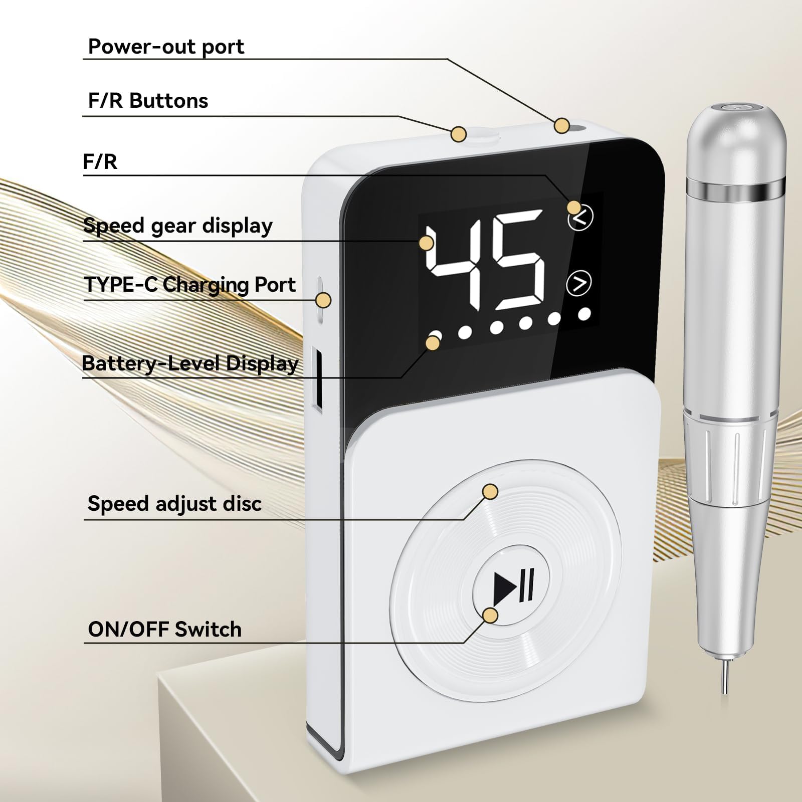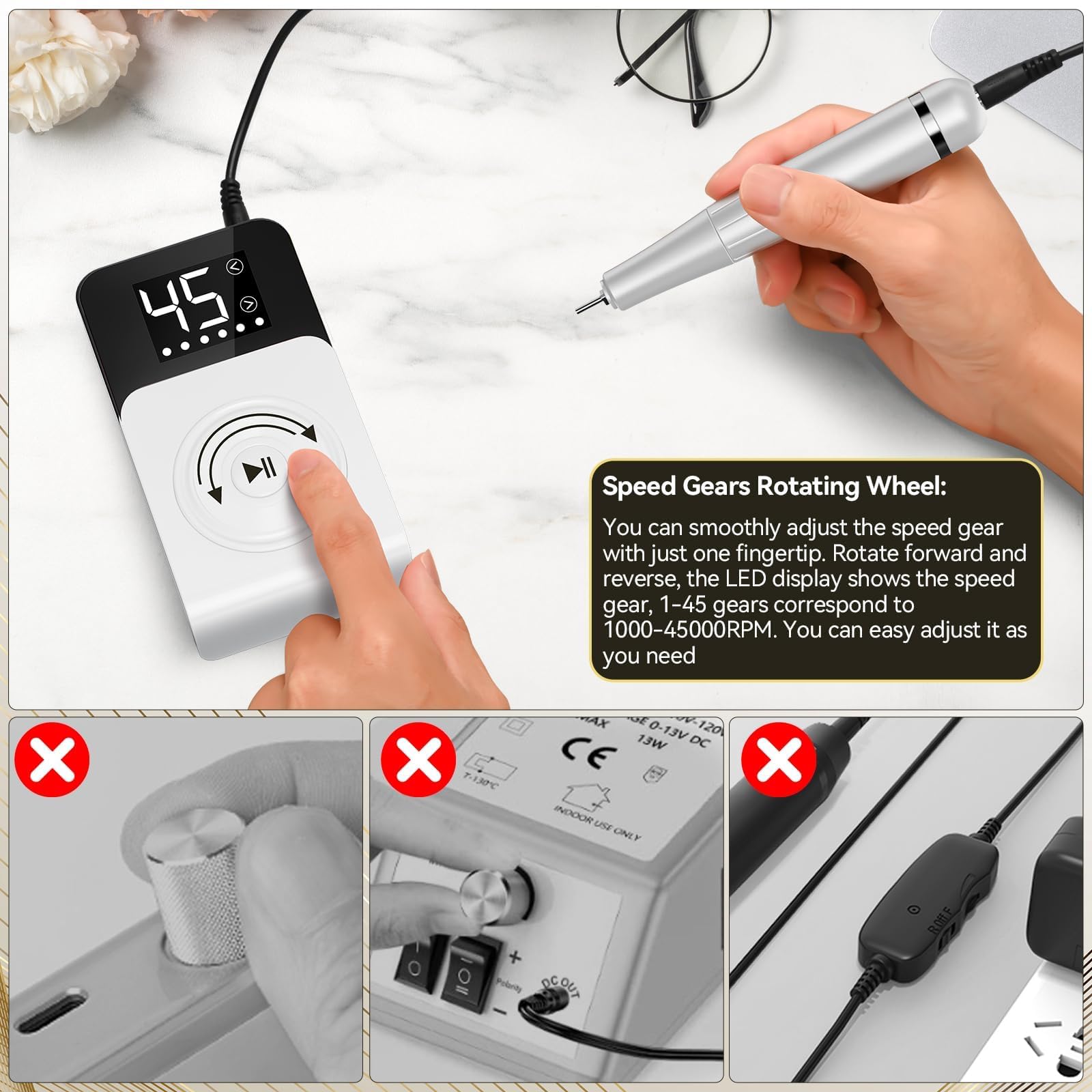 - Easy to Handle: Speed can be easily adjusted by simply turning the gear disc, 1-45 gear adjustable(1000-45000RPM).Nail drill kit features LED display and shows speed gear position, battery level and direction, Forward and reverse rotation direction easy for right handed or left handed operation.The professional nail drill combines visual appeal and ease of use in one device. Best gifts for nail art enthusiast