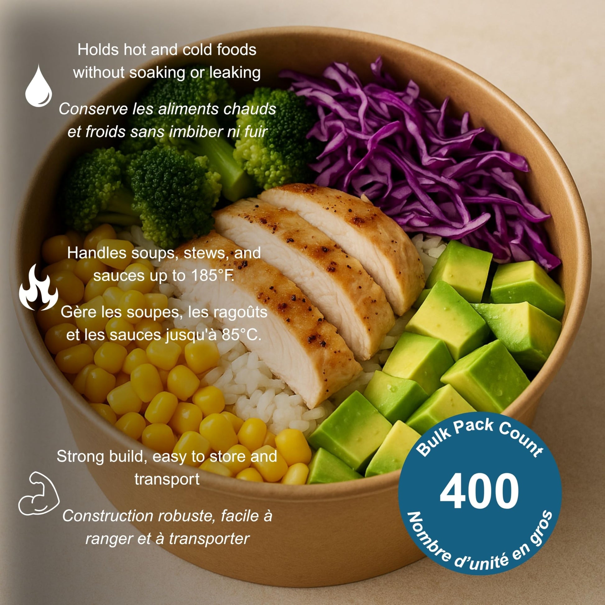 Café Express 8 oz Brown Kraft Paper Soup Bowls, 400 Count (8 x 50) – Disposable Takeout Containers, Microwaveable, Leak & Grease Resistant, for Hot & Cold Foods