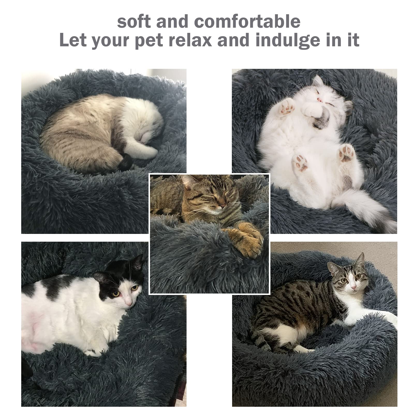 Calming Dog and Cat Bed Donut - 23.6'' Dog Bed Small, Fluffy Cat Anti Anxiety Beds for Indoor Cats, Washable Pet Bed with Non-Skid Bottom for Dogs and Cats, Dark Grey L(23.6in/60cm)
