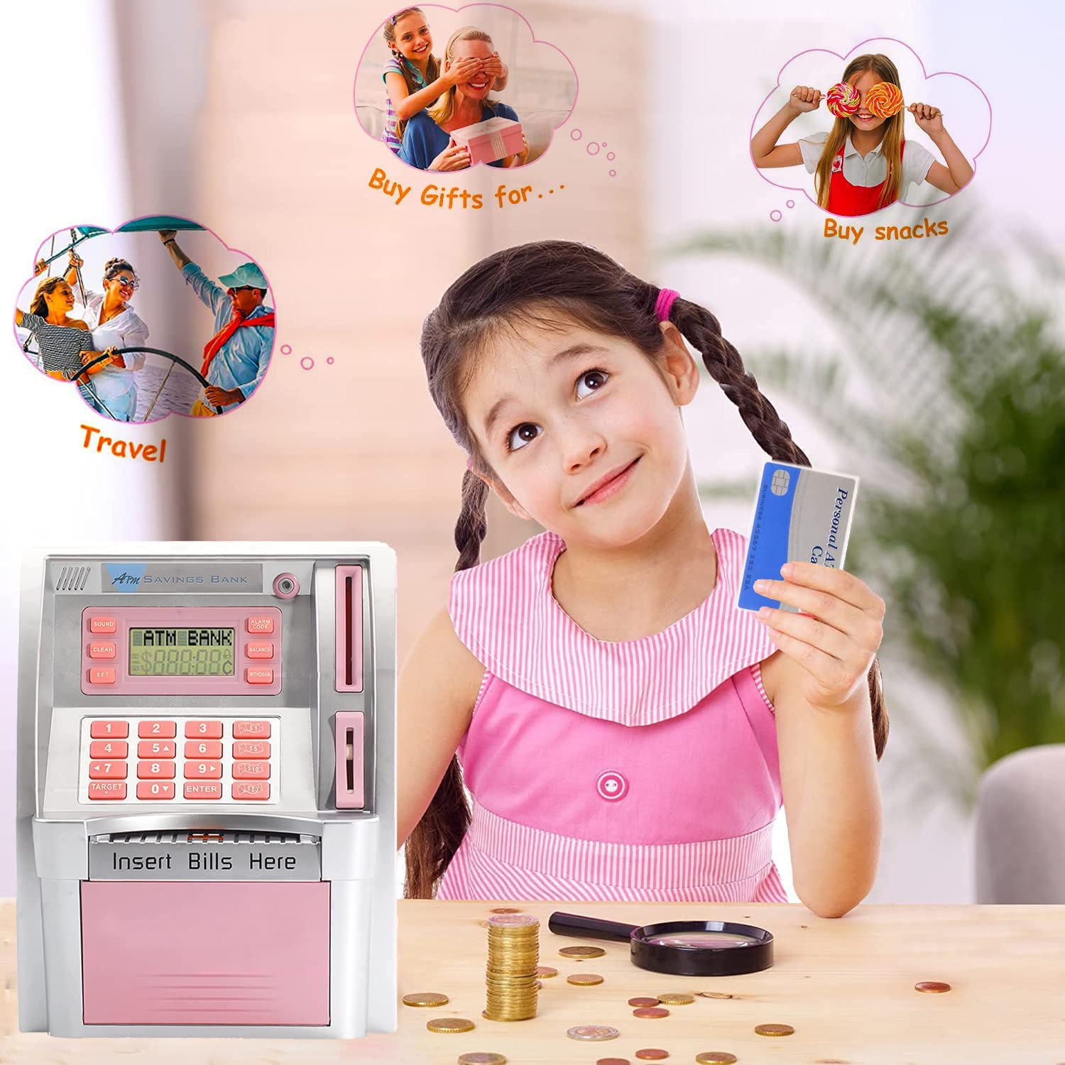- ★Realistic Banking Card to Access Savings, PIN Code Protected--Just insert the card and enter 4-digit code, the LCD screen lights up and makes voice prompt, Deposit or withdraw money, check your balance, perfect for your kids birthday gift or Christmas present, really a cool stuff.