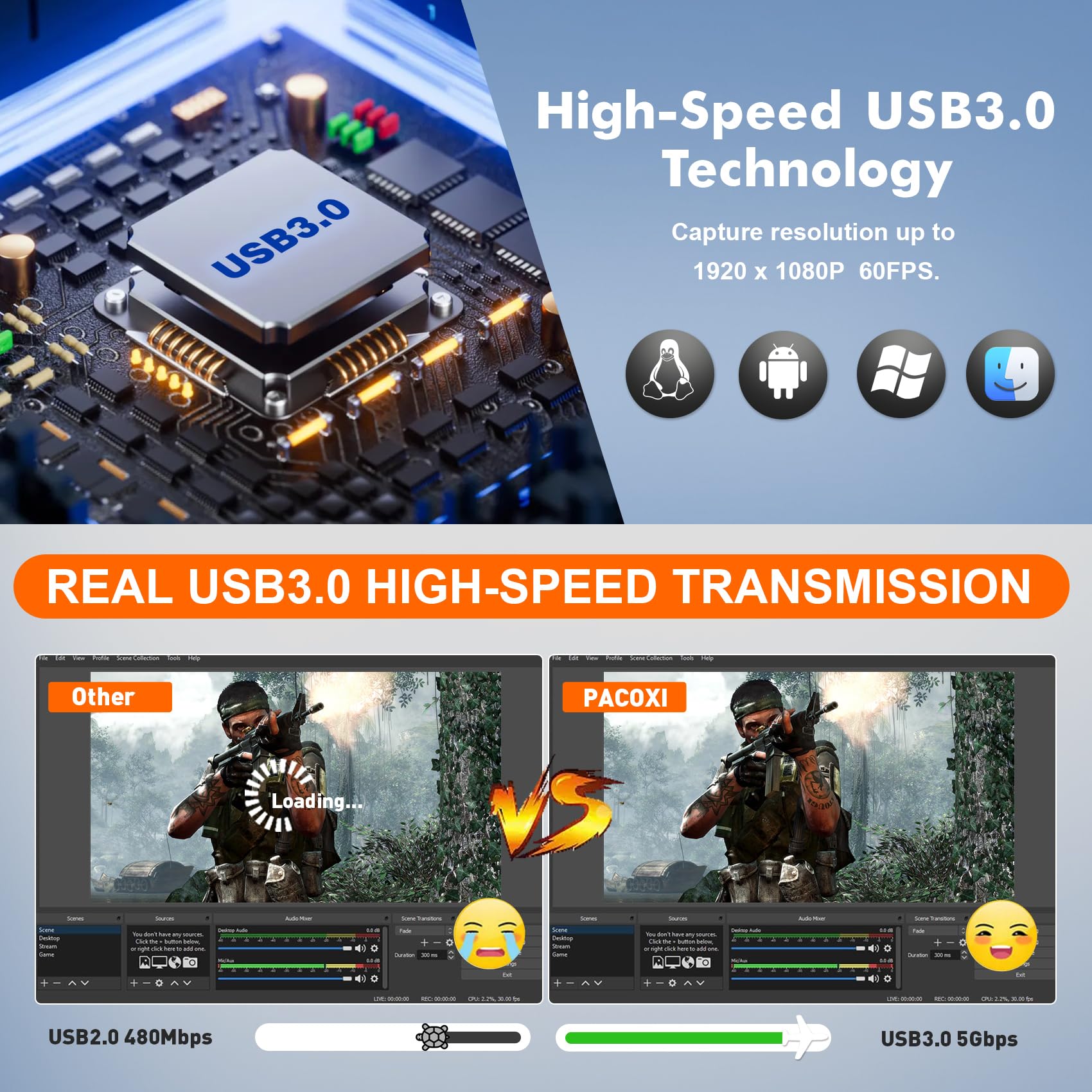 - 【Real USB3.0 YUY2 1080P 60FPS Capture Card】It is a real USB3.0 HDMI capture card with real USB3.0 protocol chipset, fast transfer rate and low power consumption. It can support capture YUY2 1080P 60FPS resolution,share superb game skills with excellent visual experience.