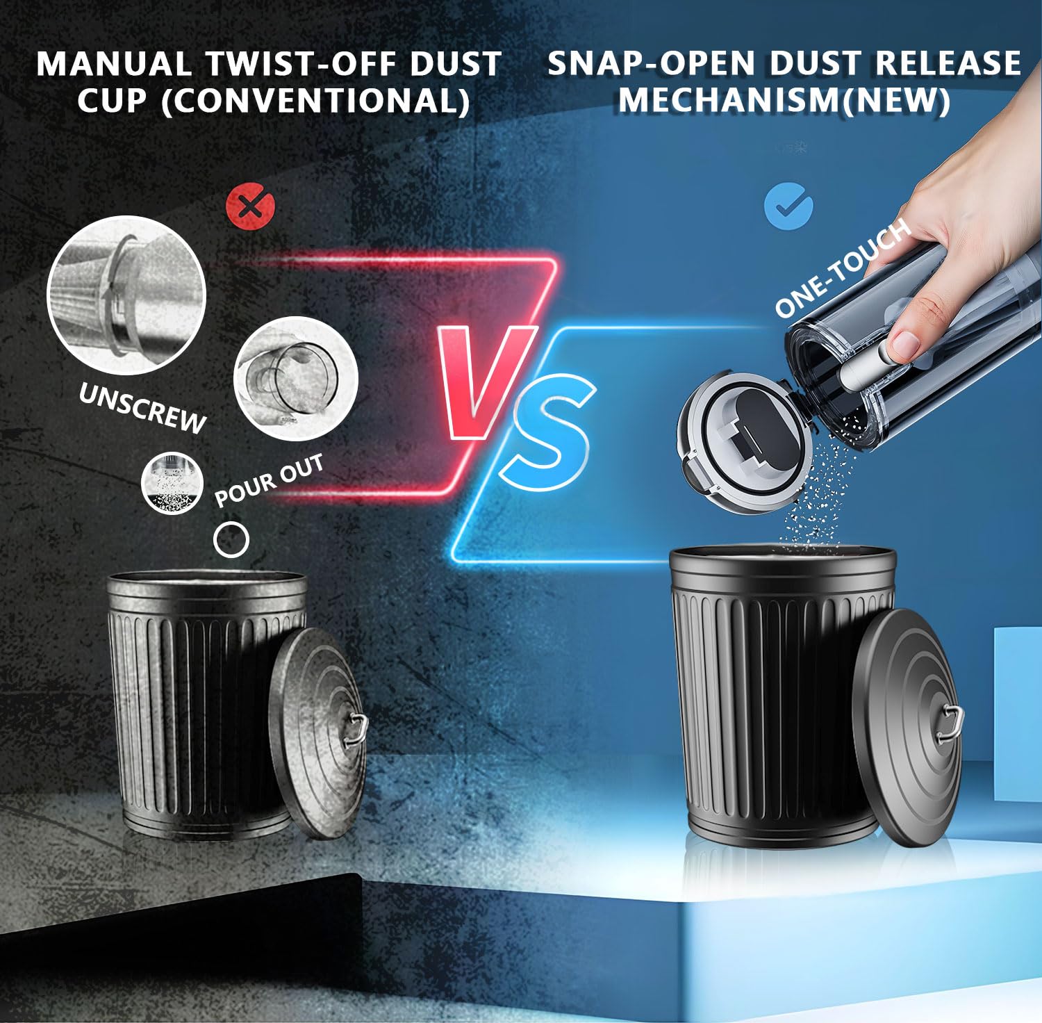 - 【Easy-press Dust Release】Effortlessly empty debris with the quick-release button—no need to remove the entire dust cup. Just press to open the nozzle for mess-free cleaning.
