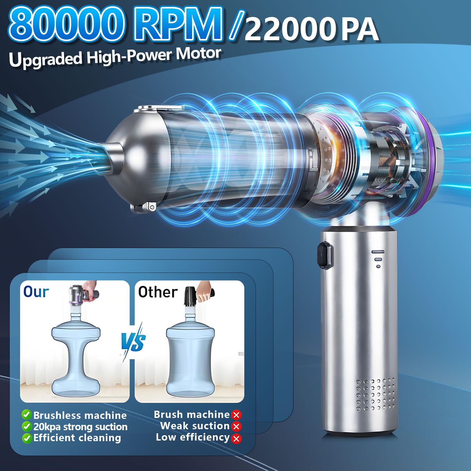 - 【Powerful Suction】This hand vacuum cordless delivers 22000pa max suction (9000pa in eco mode), Long press ON/OFF switch for 3 seconds to start and short press to switch to high grade. It works as both a dust buster handheld vacuum and an air blower—perfect for removing pet hair, crumbs, and dust from car seats, sofas, and tight spaces. Plus, it doubles as an inflator for balloons and pool toys!