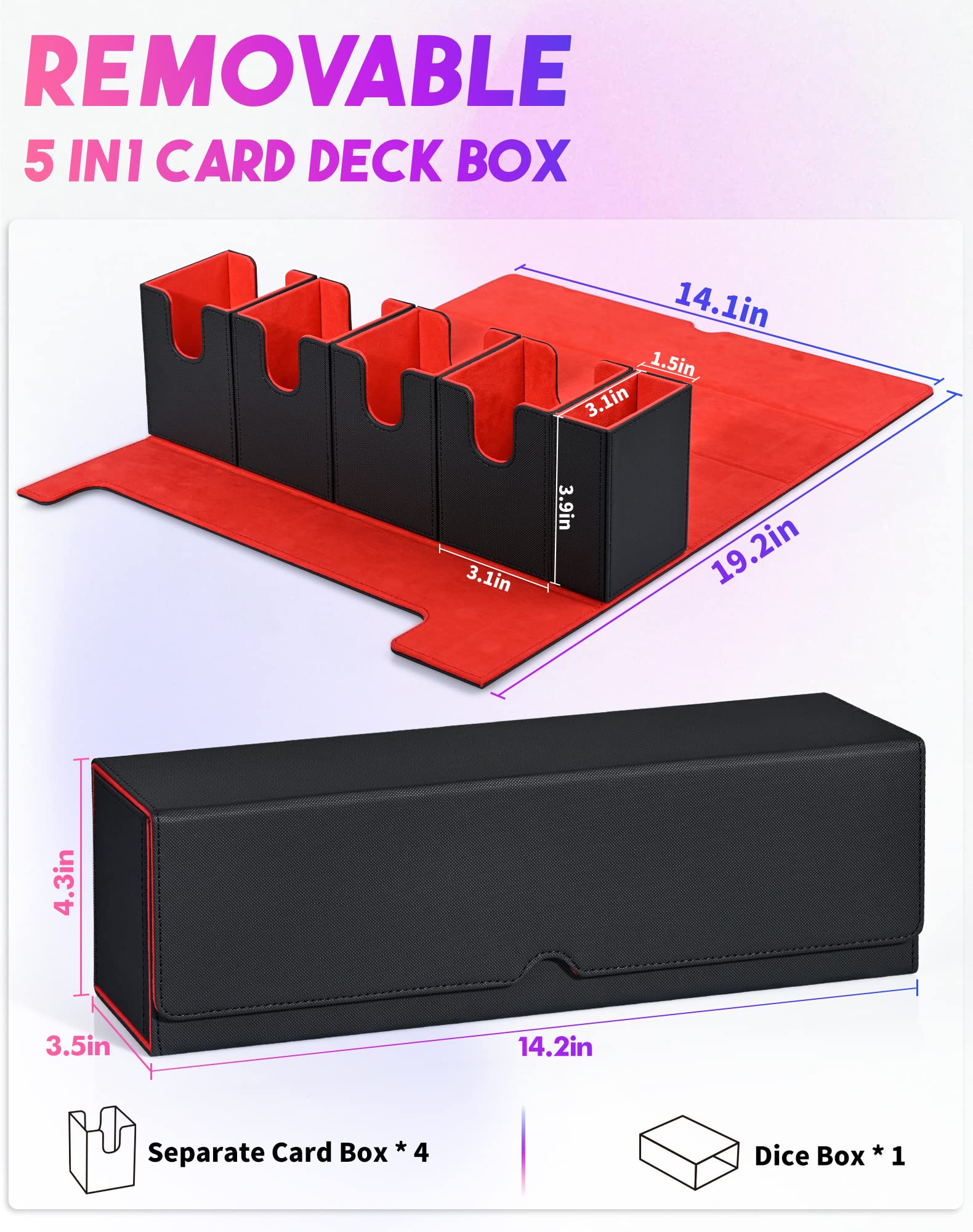 - 5-in-1 Card Deck Box: Comprises 4 separated deck box, a dice/token box and a cover, making it easy to play and organize multiple decks. The detachable lid can double as a playmat if you forgot yours at home