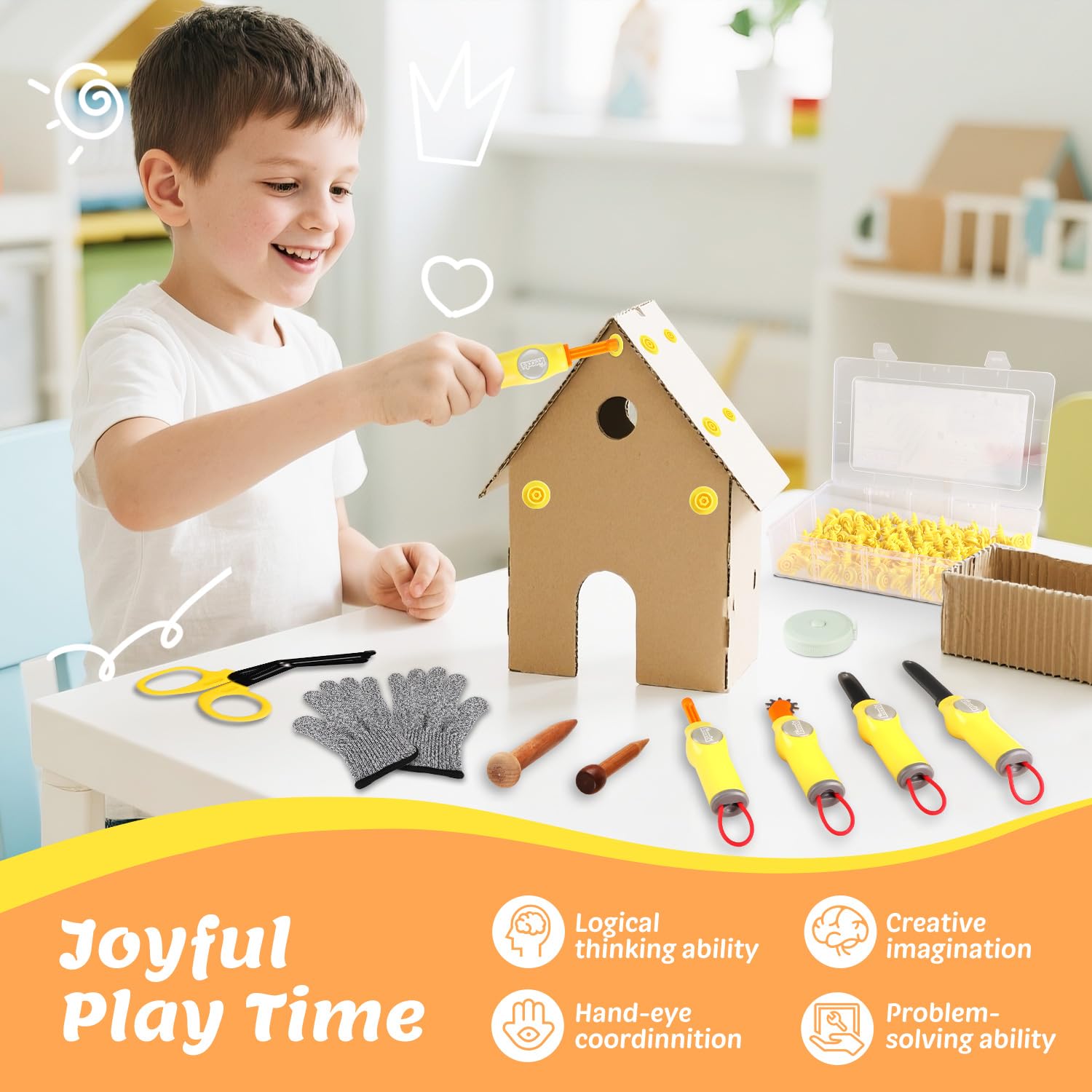 - 【Enlightening & Ideal Gift】- This kids tool set ignites imagination in boys and girls aged 5+. Includes simple instructions for cardboard houses for independent building easily, kids use safe tools to cut, fold, and build amazing creations like houses, castles, and robots – transforming ideas into 3D reality! The ultimate thoughtful gift for Birthdays, Christmas, or New Year, guaranteed to delight and inspire for hours!