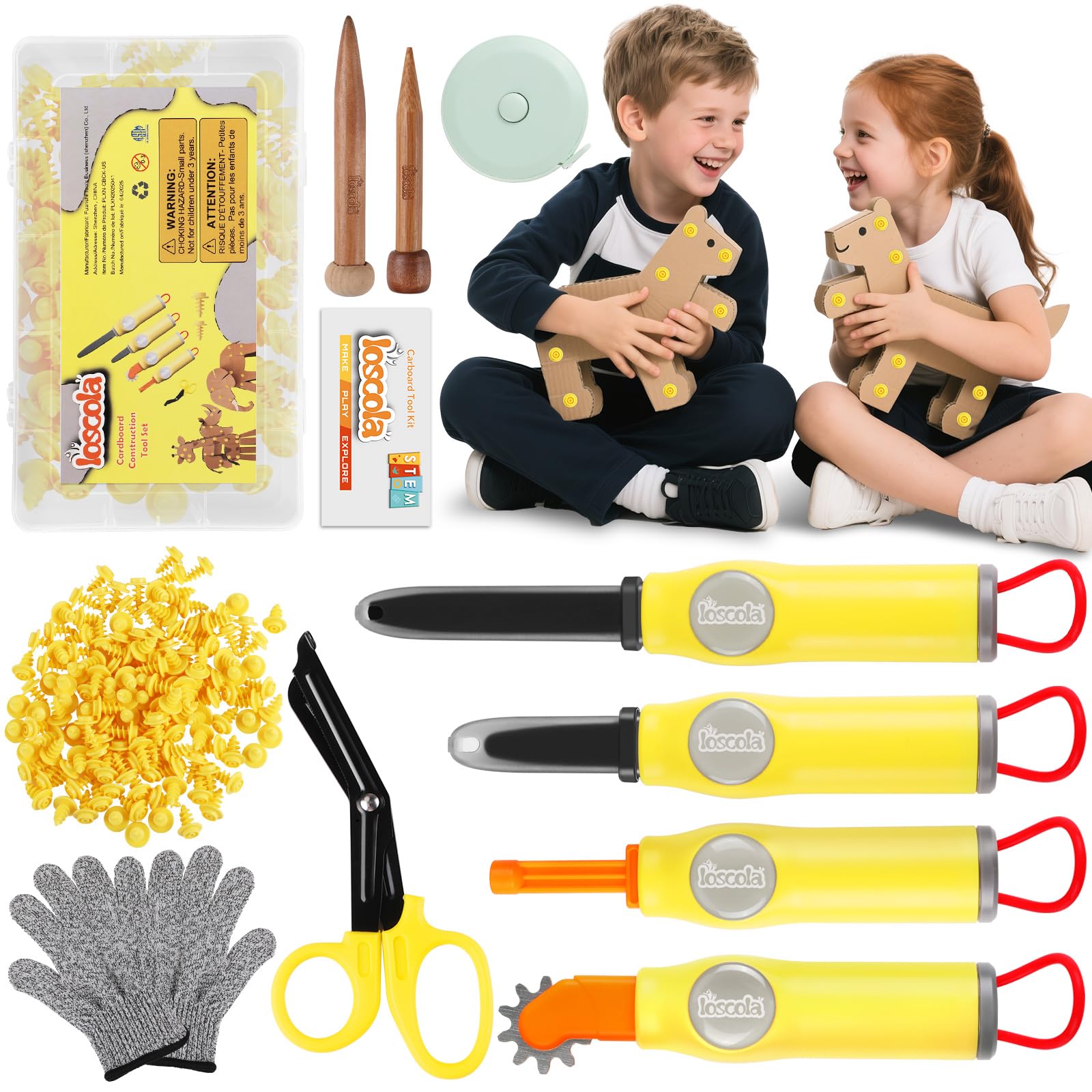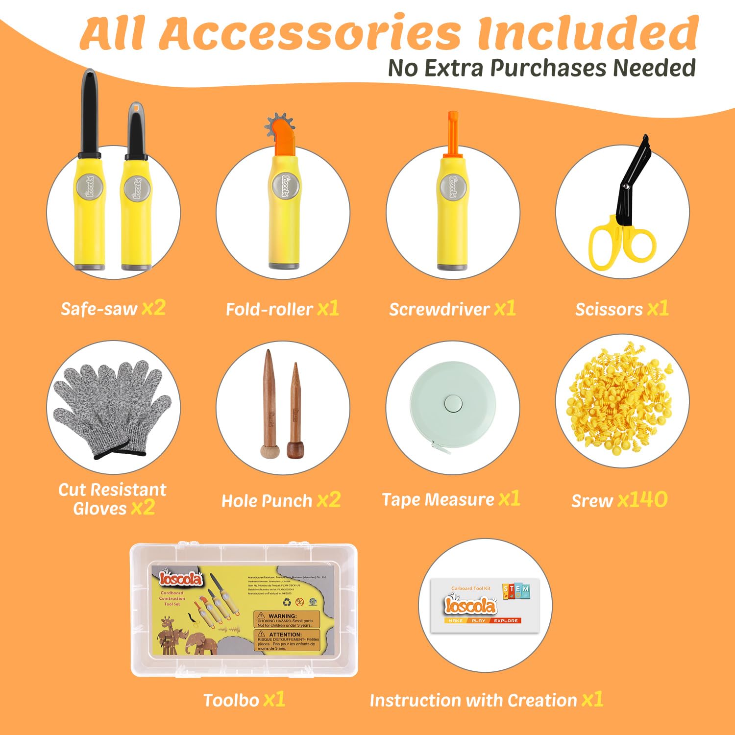 - 【Complete Cardboard Cutter Toys Kit】- Everything included! 153pcs cover cutting, punching, assembling & fastening. Includes: 2 saws, 1 folding roller, 1 screwdriver, 140 screws(over 20pcs than others), 1 scissors, 2 cut-resistant gloves, 1 tape measure, 2 hole punchers, 1 plastic storage box, 1 instruction sheet, 1 box. Comprehensive set - no extra parts needed. This kit sparks kids' creativity & imagination while developing hand-eye coordination, logical thinking, and problem-solving skills.