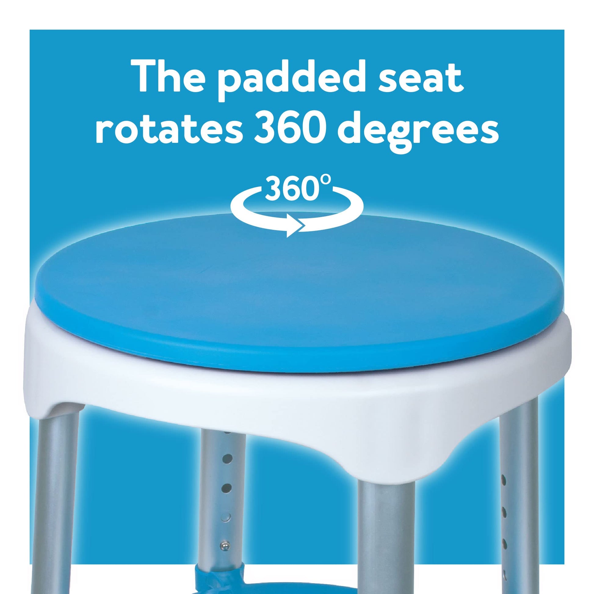 Details: The Carex EZ swivel stool assembles quickly with no tools. The padded seats rotates 360 degrees and offers easier entrance and exit to the bathtub. The swivel stool includes non-slip tips to increase stability and an added storage tray.