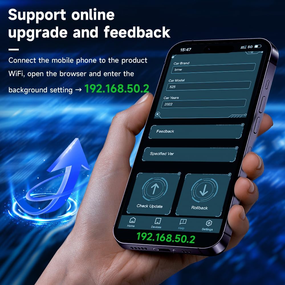 - 【Online upgrades, quick solutions】:After inserting the box into the car, The mobile phone turns on the WIFI search signal, Password: '' 12345678 ''Then open the browser that comes with your phone, enter the URL: 192.168.50.2 to enter the device background, click on the help page, click '' Check updates '' to upgrade online.