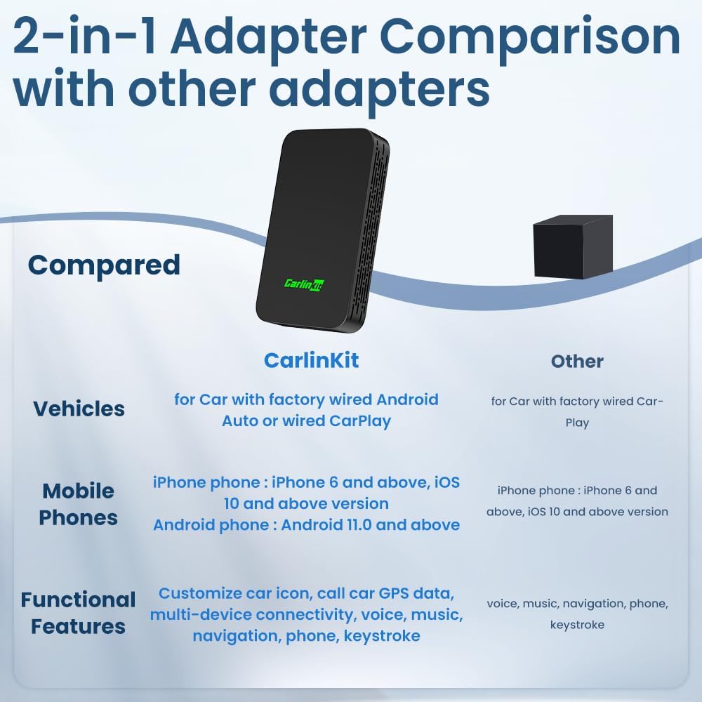 - CarlinKit 5.0 2air 2 in 1 wireless Adapter, you can enjoy the full functionality of Android Auto/CarPlay. Like navigation, music playback, phone calls, messaging, voice, and more. Additionally, it seamlessly integrates with your car's existing operations, such as touchscreen controls, voice commands, buttons, and knobs.