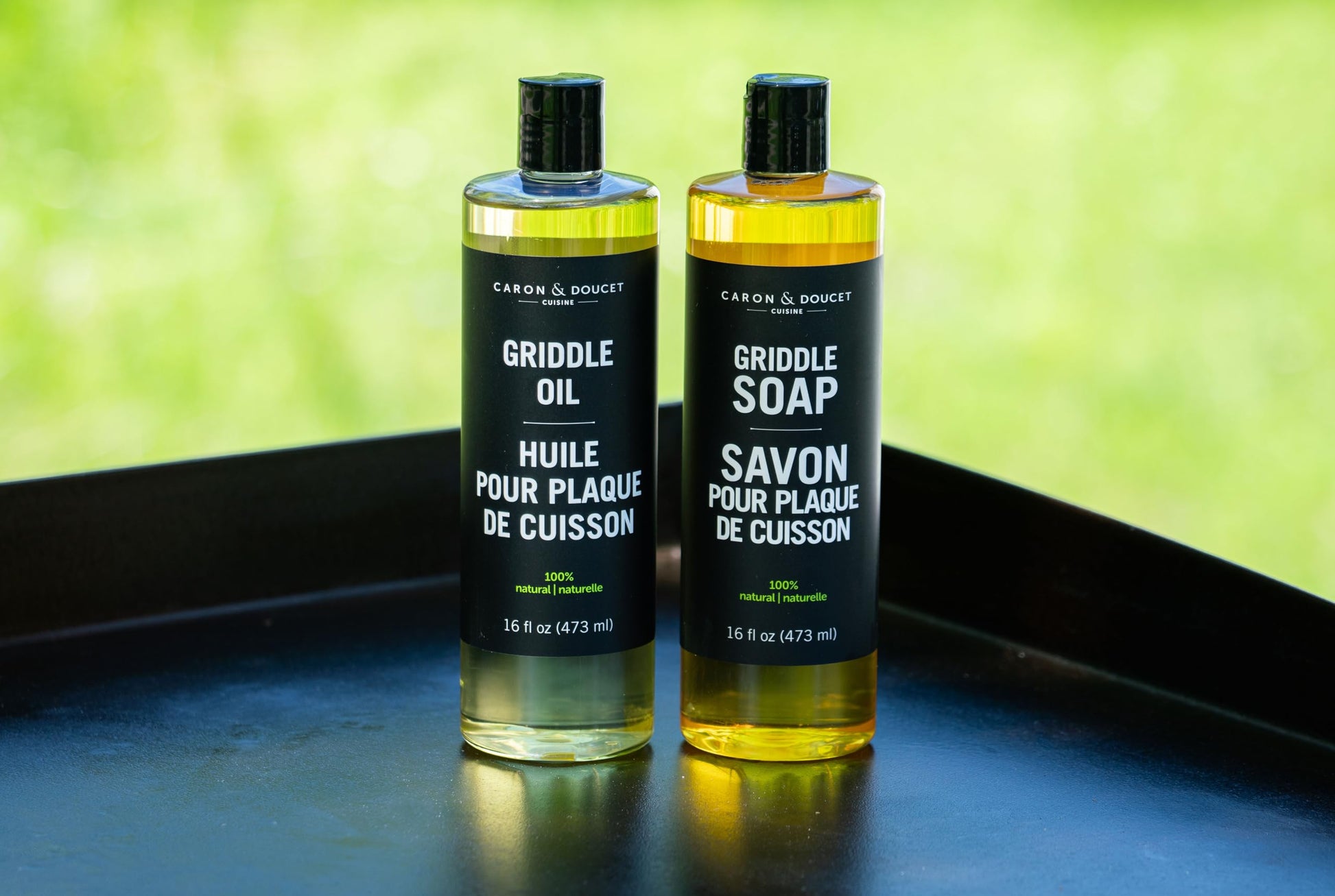 CARON & DOUCET - 100% Plant-Based Griddle Cleaning Set: Seasoning Oil & Soap for Washing, Restoring & Seasoning Griddles!