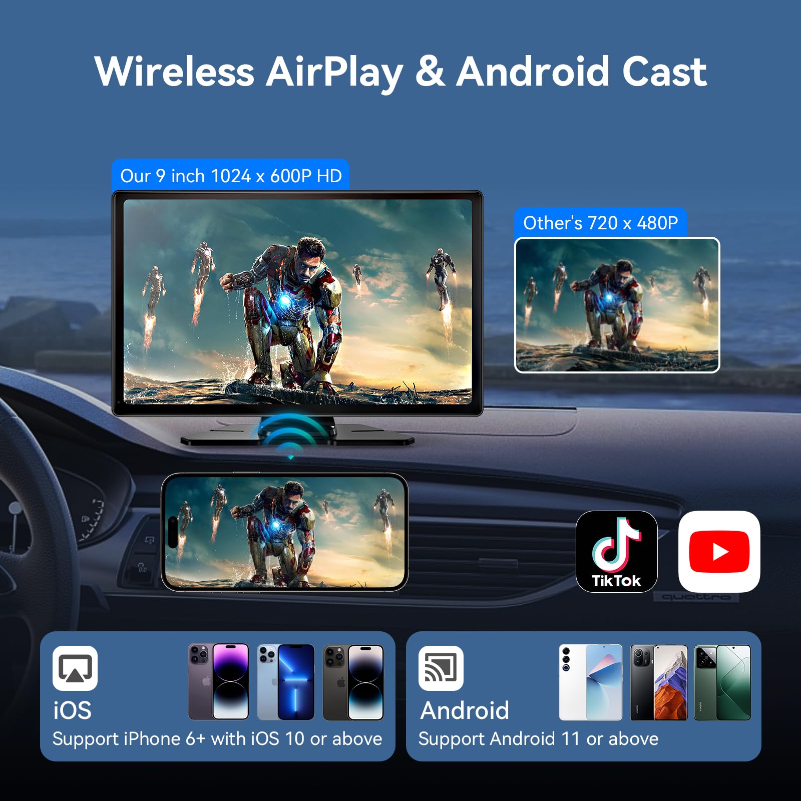 - šćWireless Carplay & Android AutoćProtable carplay screen for car is compatible with Apple Carplay & Android Auto. With WiFi and Bluetooth connections, you can use your phone's music, navigation, calling and messaging functions on the android auto screen. You can connect automatically next time. The carplay screen makes your journey fun and enhances the driving experience.