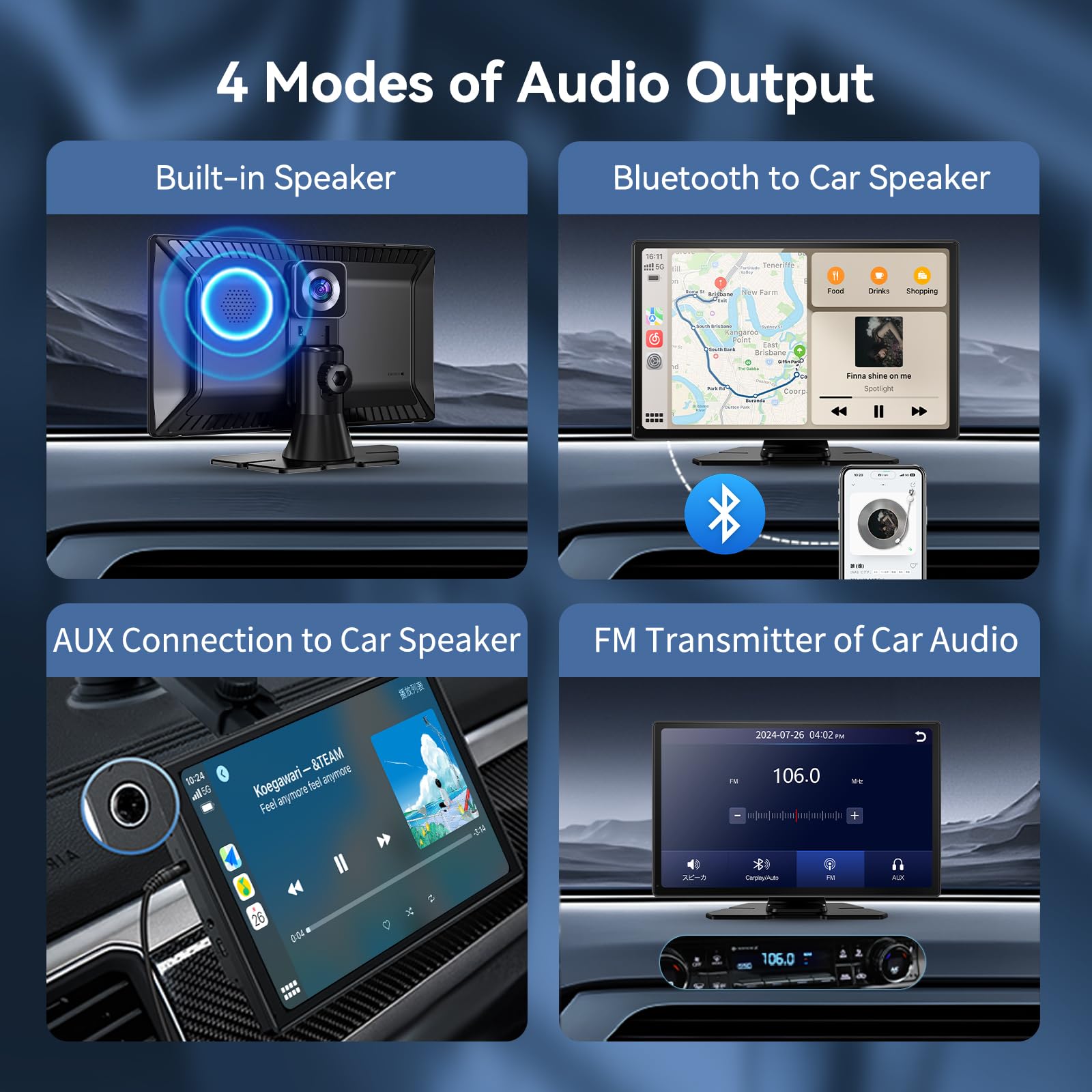 - šćUpgraded Audio Output Mode & Adjustable BrightnessćOur a-pple carplay screen has four audio options including AUX, FM transmitter, Bluetooth and built-in speakers that greatly improve the sound quality of the android auto screen. Our car play screen for vehicle automatically adjust the brightness of the screen according to changes in ambient light, and can also be adjusted according to your preferences for a more comfortable driving experience while protecting your eyes.