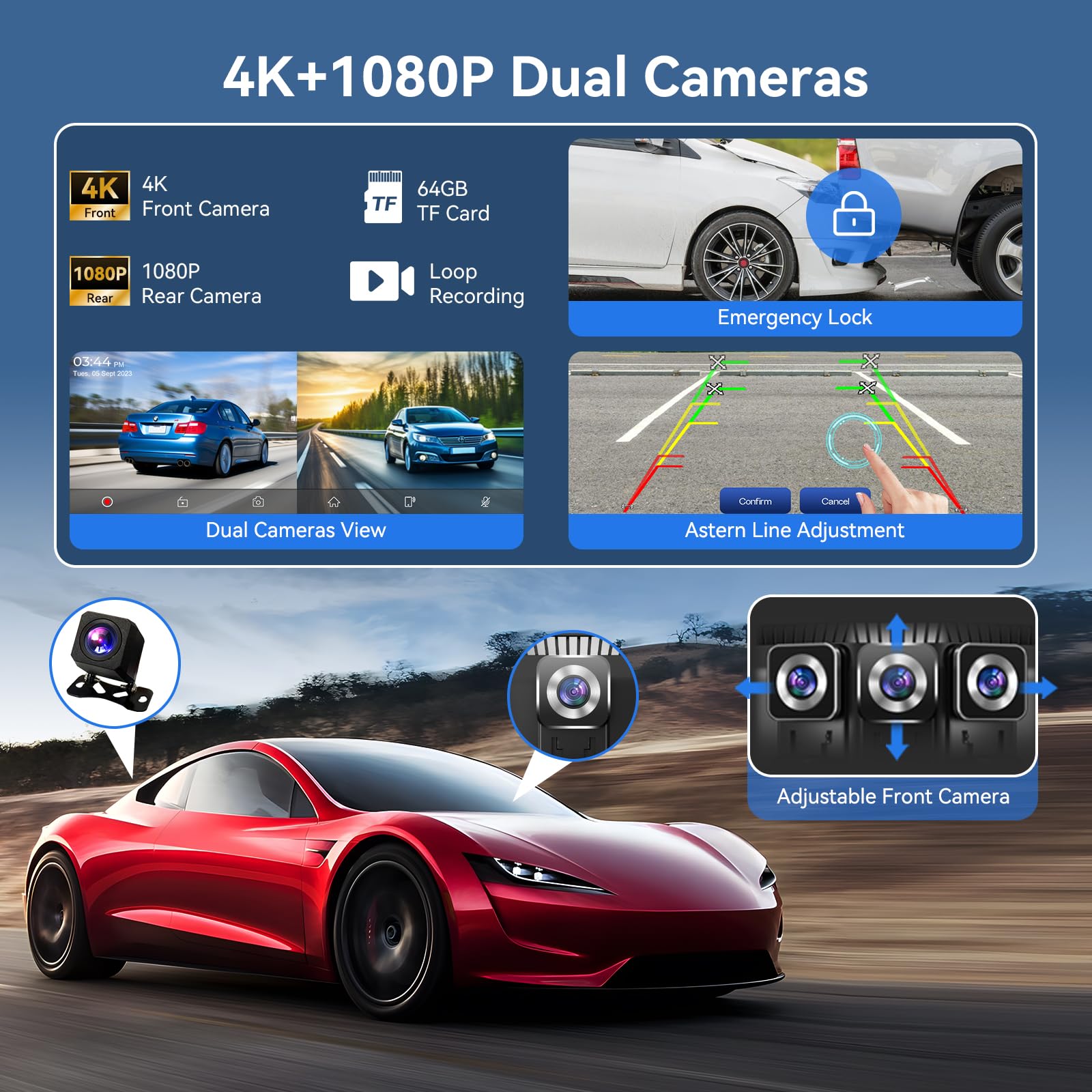 - šć4K Front + 1080P Rear Dual Dash CamćThe car screen has a 4K HD front-facing camera with a wider viewing Angle, and comes with a 64GB tf card to continuously record road conditions and capture images of the surrounding area, greatly improving driving safety. Our carplay screen also has a 1080P reverse camera with an 18-foot cable. When the vehicle goes into reverse, the wireless carplay screen will automatically switch to the rear camera image display to ensure safer reversing and parking.