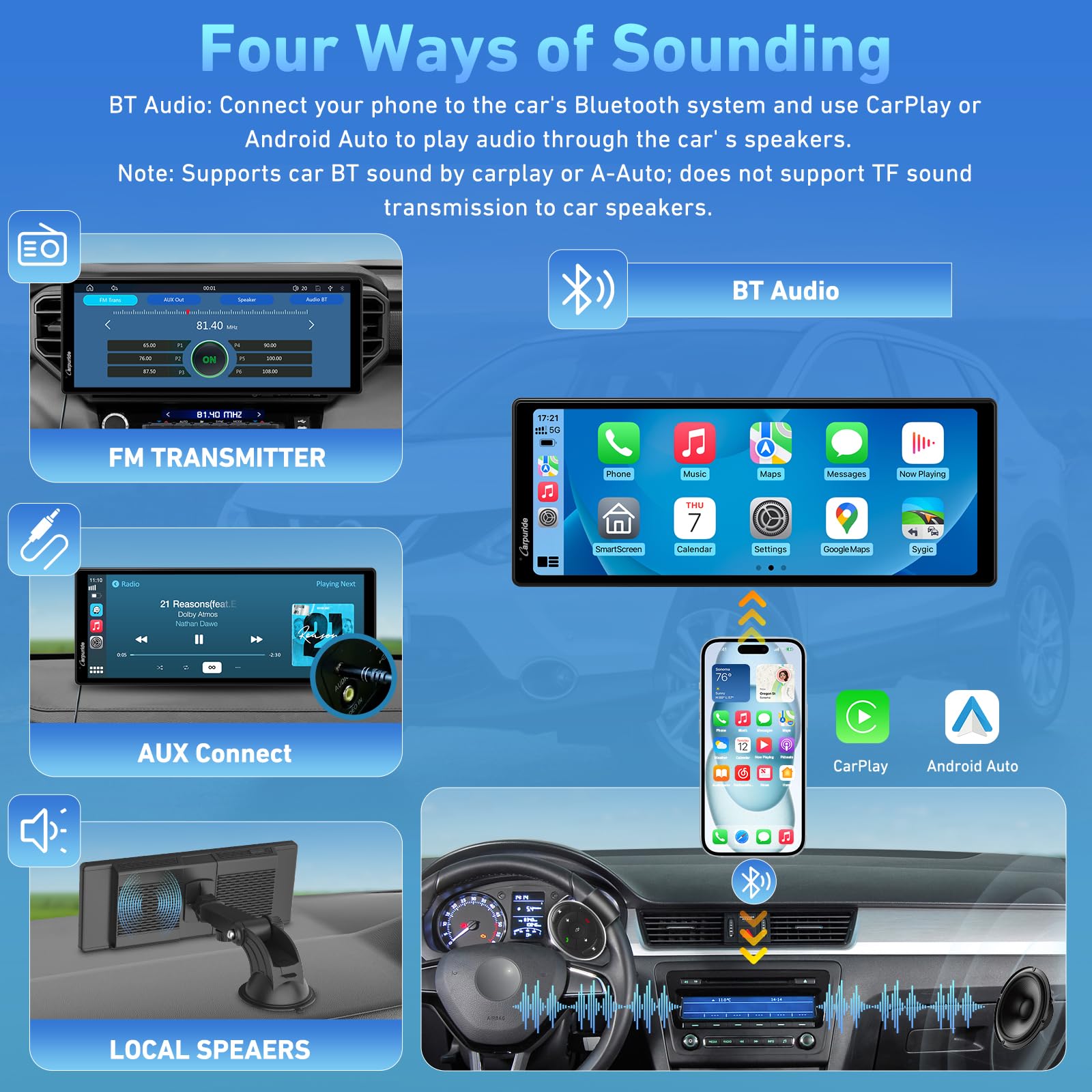 - 【Notice】FM supports 2402-2480MHz. The product outputs 5V. If your car operates at 12V, please use the original CARPURIDE power supply, which can convert 12V to 5V. This will prevent issues such as smoking caused by voltage discrepancies!