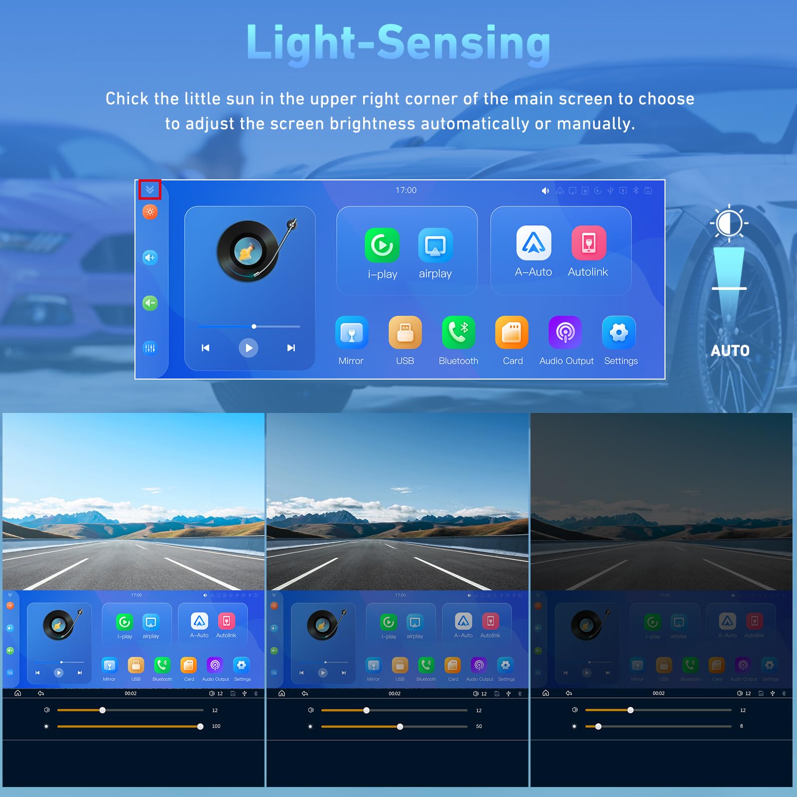 - 【A/ M Adjustment Sensor Light Design】The Carpuride sensor Light is specifically designed to protect your eyes while driving. When you drive through a tunnel, the sensor light will automatically dim the display. when you exit the tunnel, the sensor light will automatically brighten the display to prevent eye strain and ensure optimal visibility. The carpruide 9.3 inch display has 10 levels of brightness adjustment. And supports manual adjustment of screen brightness.