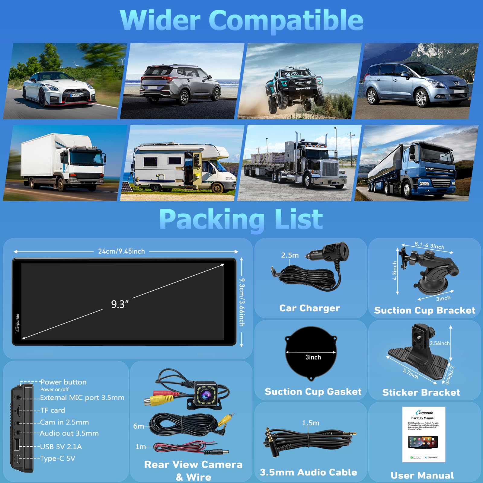 - 【Universal Compatibility】The CARPURIDE 9.3 inch car stereo system is remarkably adaptable, powered by a 5V 2.5A Type-C connector via the cigarette lighter or a high-speed USB charger, though the current must be 5V2.5A/5V3A to prevent the CarPlay screen from automatically shutting off due to insufficient power. Designed to operate within a voltage range of 12-24V, it is compatible with almost all cars, RVs, SUVs, pickups, and trucks, regardless of their make, model, or year.