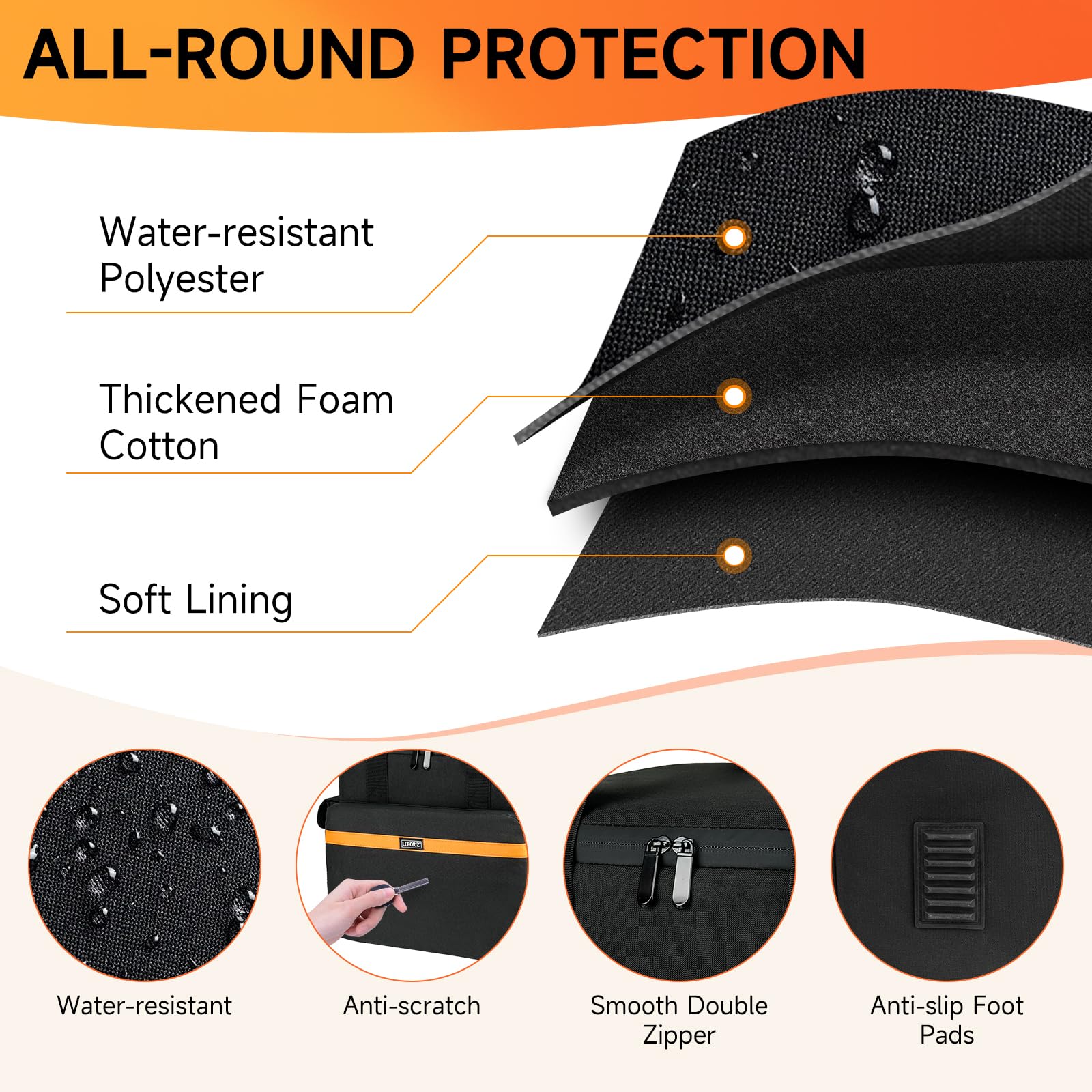 - Multiple Protection:This storage bag is made of tear-resistant and waterproof material, with a thick inner lining, which can effectively protect your power station from dust, scratches and moisture. The non-slip foot pad provides good support while avoiding direct contact with the ground, reducing friction, strong and sturdy
