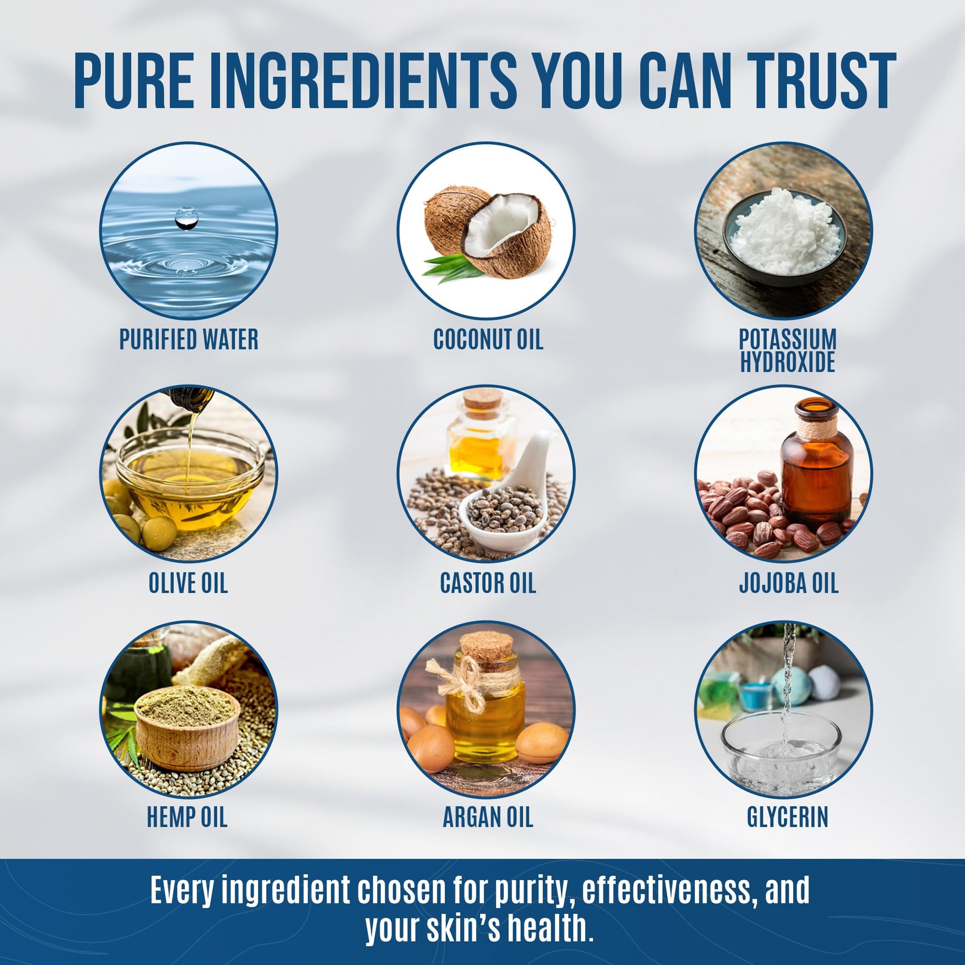 - Mild & Gentle for All Skin Types – Perfect for sensitive skin, babies, and those with eczema or allergies, our Castile Liquid Soap provides a soothing, non-irritating cleanse. Made with organic coconut, olive, and hemp oils, it moisturizes and nourishes deeply, leaving skin soft, healthy, and refreshed without harsh chemicals or synthetic additives.