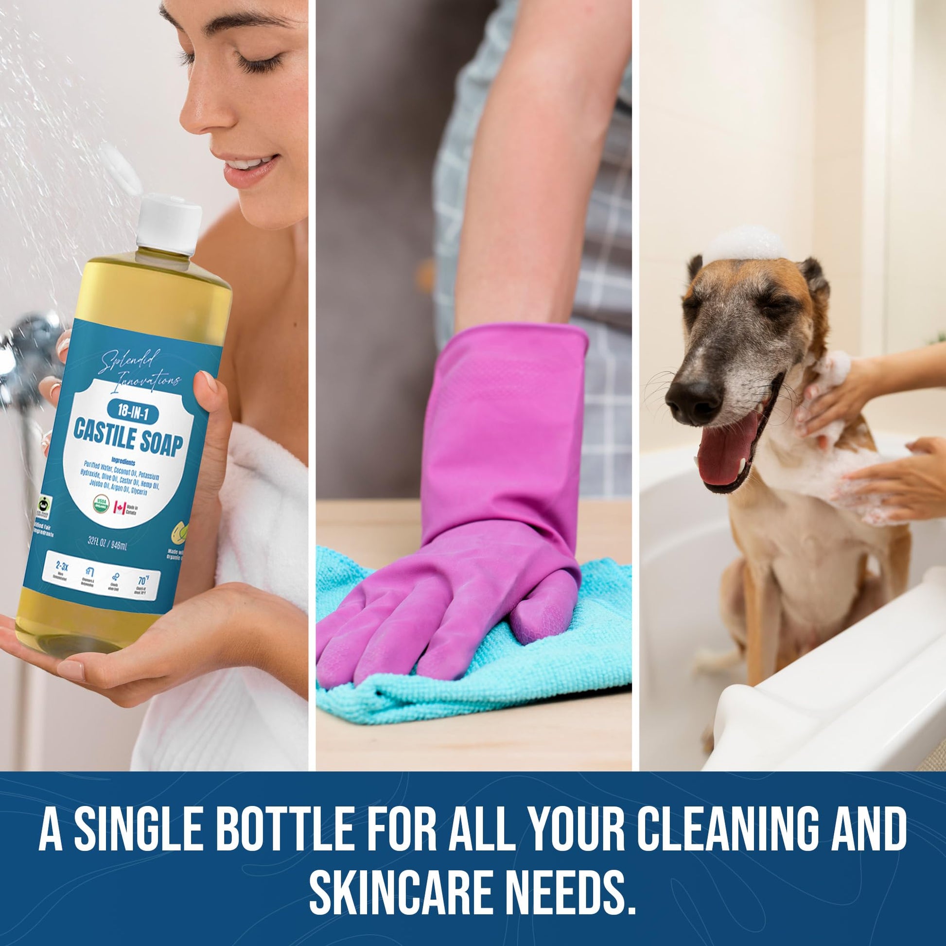 - Versatile 18-in-1 Uses – From body wash and hand soap to household cleaning, dishwashing, and even pet care, our Castile Liquid Soap does it all. Its multi-purpose, plant-based formula makes it a gentle yet effective choice for a variety of uses, reducing the need for multiple products while keeping your skin, home, and pets clean—naturally!