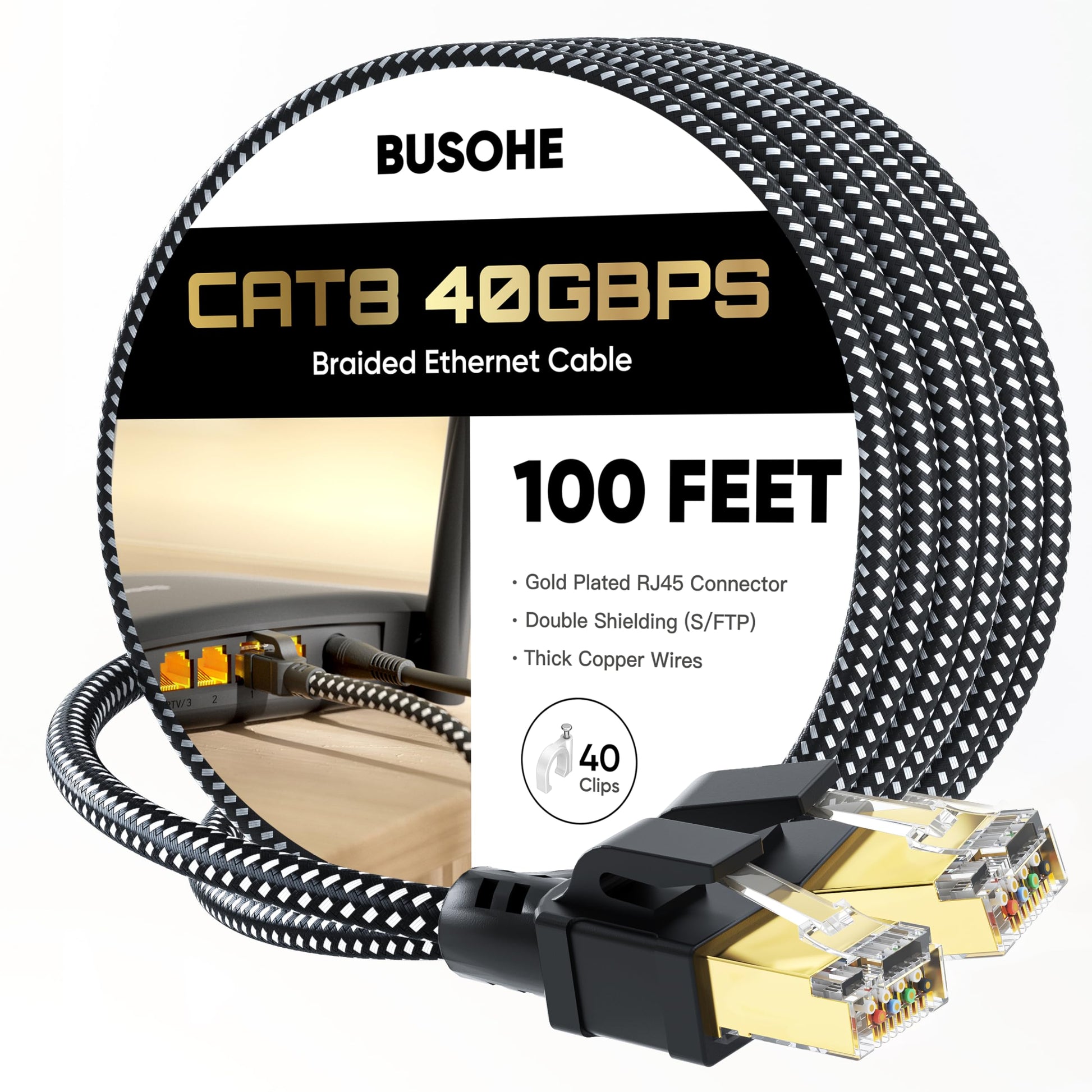 Cat 8 Ethernet Cable 100FT, BUSOHE 40Gbps 2000Mhz High Speed Braided Network Internet Cable with Gold Plated RJ45 Connector, Heavy Duty Patch Cord LAN Cable 40 Clips,S/FTP Indoor for Router/Gaming/PC