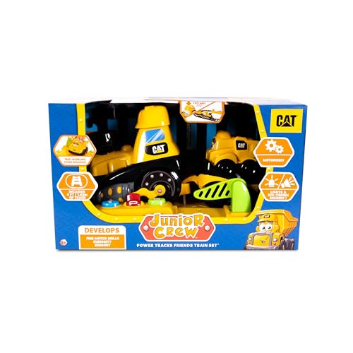 - SUPER CUTE PRESCHOOL TRAIN SET: Motorized CAT preschool train set that includes an CAT Construction character engine car carrier free wheeling CAT Construction dump truck and track.