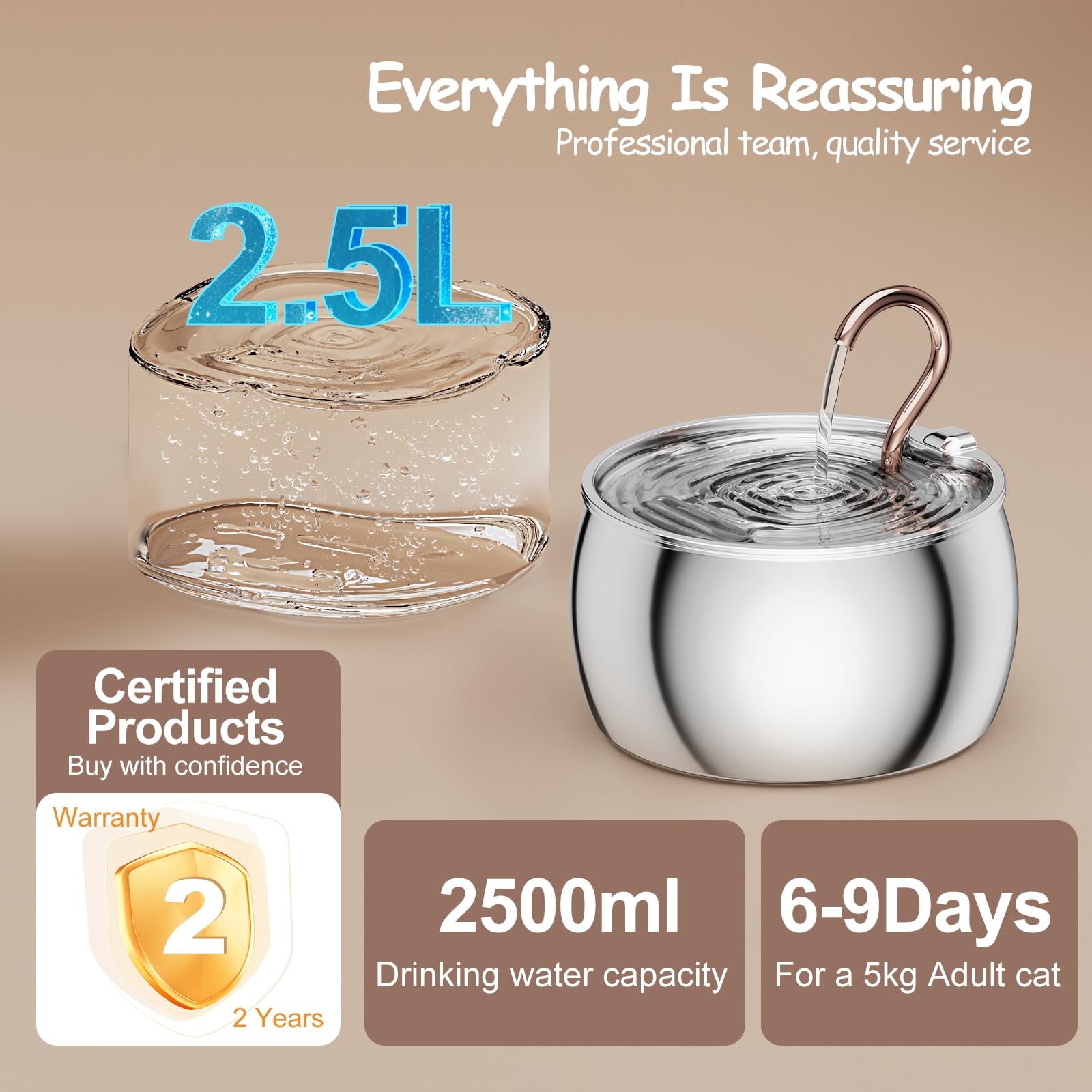 - Stainless Steel Plated Faucet: The stainless steel cat water fountain features a stylish, rust and oxidation resistant stainless steel plated gooseneck faucet, superior to inexpensive copper alternatives, will not lose its luster, corrode, or leach out the metal, ensuring a service life of up to 2 years or more, and providing a consistent and sanitary water flow. Gooseneck design helps attract pets to drink.