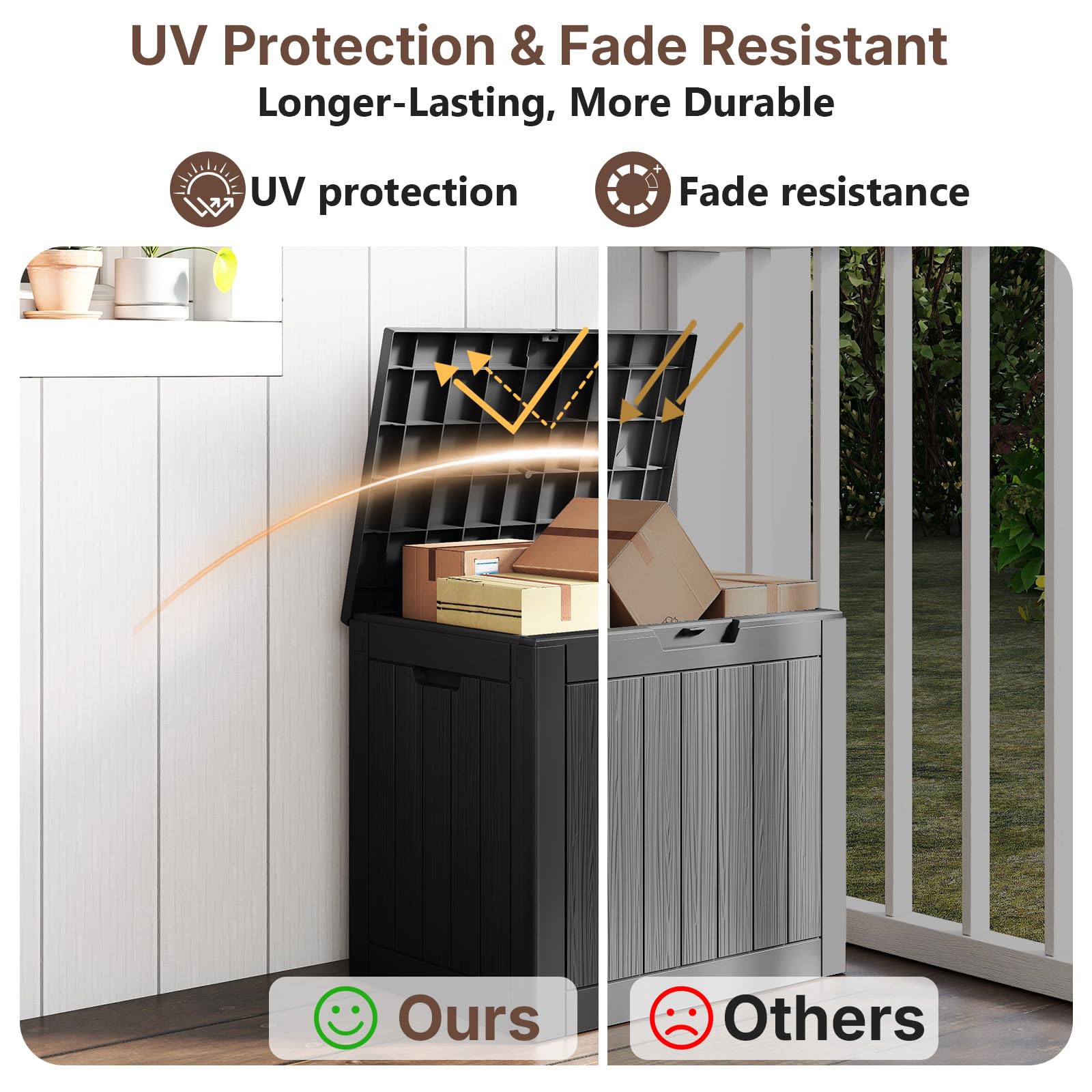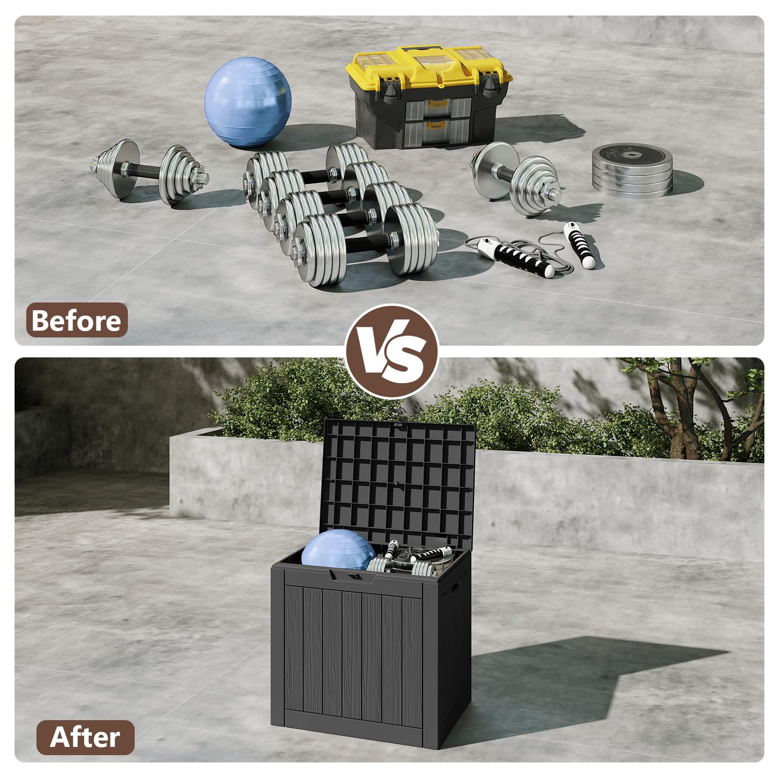 - 【Weatherproof & Durable】 Made from premium high-density resin, this waterproof box protects your belongings from rain, sun, snow, and dust. Durable and fade-resistant, it keeps your outdoor items safe and looking great season after season.