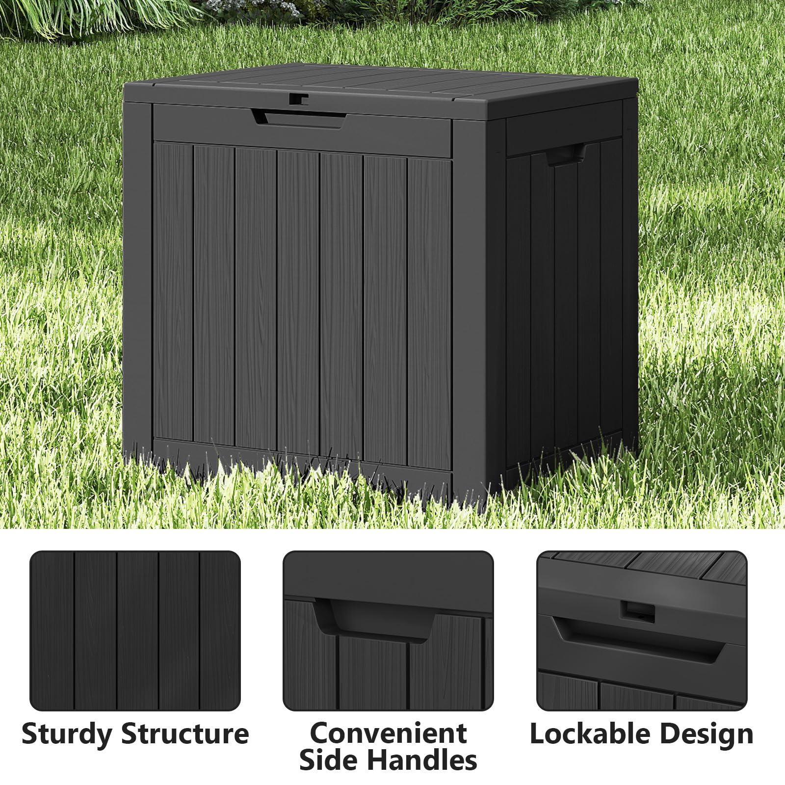 - 【Compact Spacious】 Measuring 23"L x 17"W x 21"H (58.5 x 43 x 53 cm) with 31 gallons (117 L) of storage, this small deck box keeps patio cushions, pool toys, garden tools, hoses, and more neatly organized.