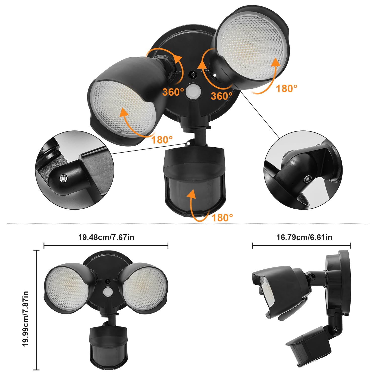 - Adjustable Light Design: Dual heads of the security light can be adjusted to different angles as you need, and the color temperature is adjustable to 3000K or 5000K. It can be installed to wall mount or eave mount