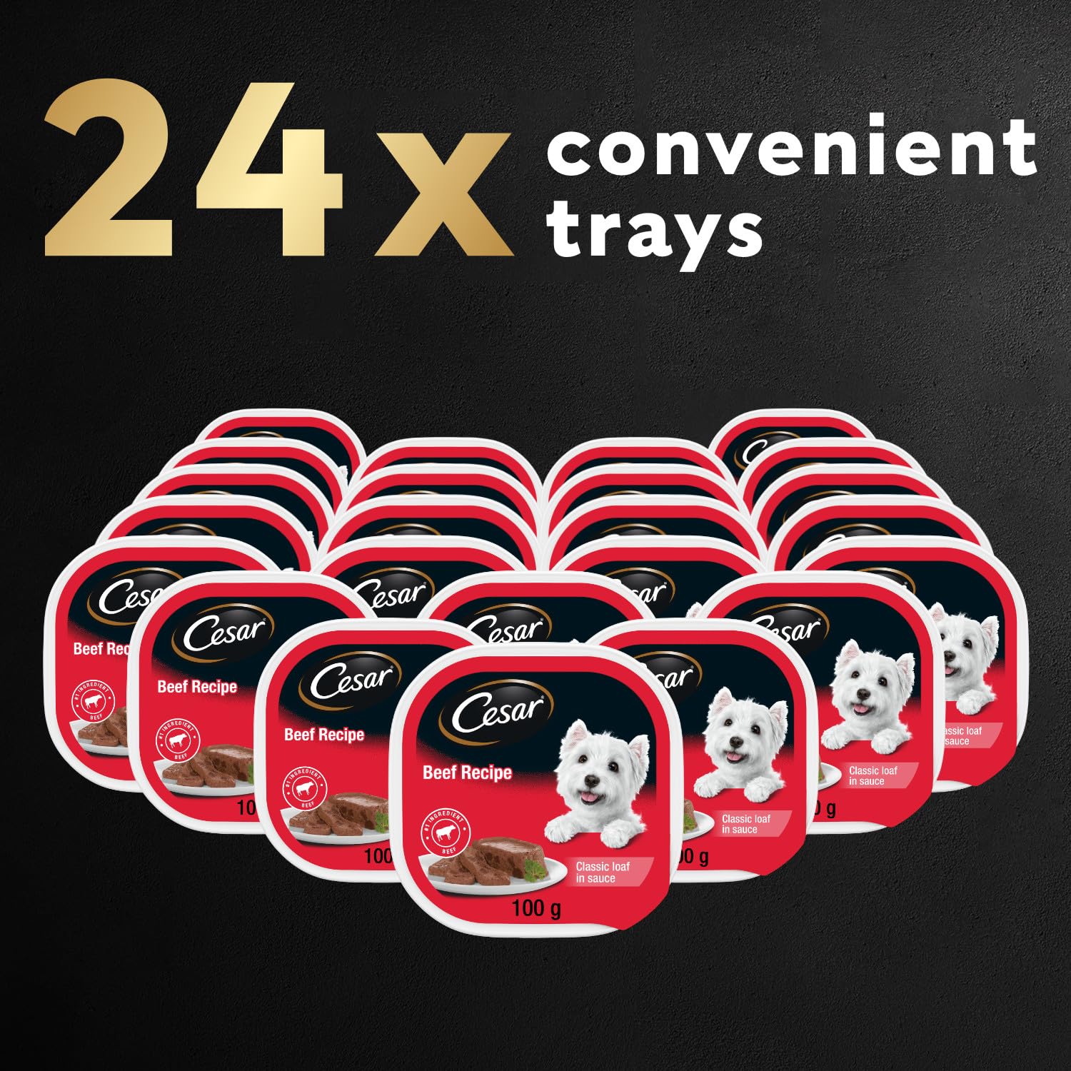 - FOR ADULT DOGS: Contains one (1) 24 count of 100g trays of CESAR Adult Wet Dog Food Classic loaf in sauce Beef Recipe