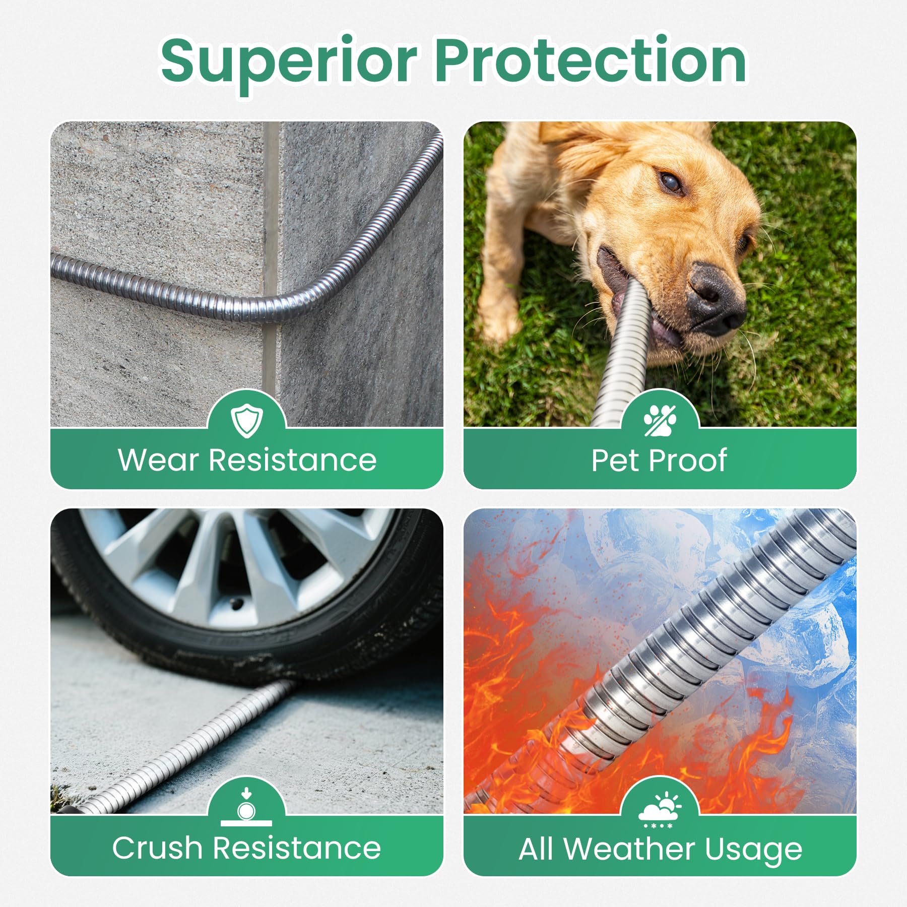 - QUALITY CONSTRUCTION: This 50 ft metal garden hose is expertly crafted from 304 stainless steel, offering durability and resistance to leaks, punctures, and tough environmental conditions. Its robust construction ensures it remains resilient against dragging over rough surfaces and potential dog bites