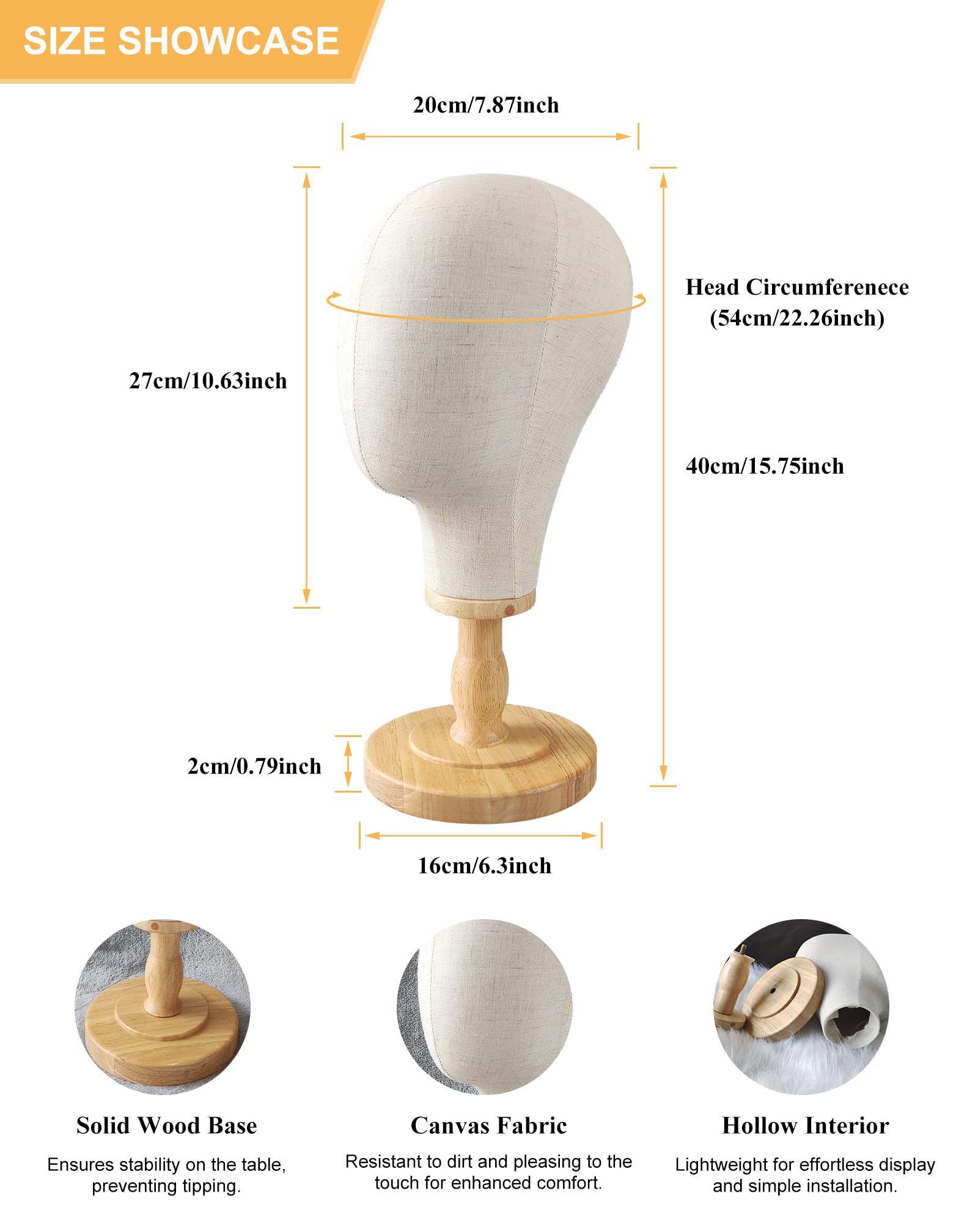 - 【Premium Material】 - The canvas block mannequin head is hollow inside, poly filled, sturdy and durable, the base and stand is solid wood - Suitable for wig, hat, jewelries making and display. (Please note that this mannequin head can't insert pins.)