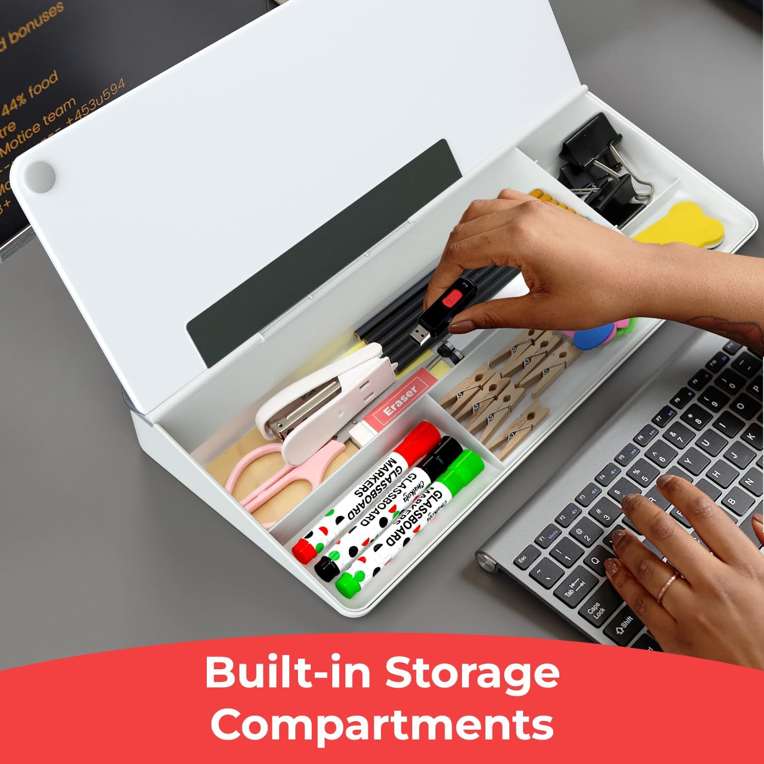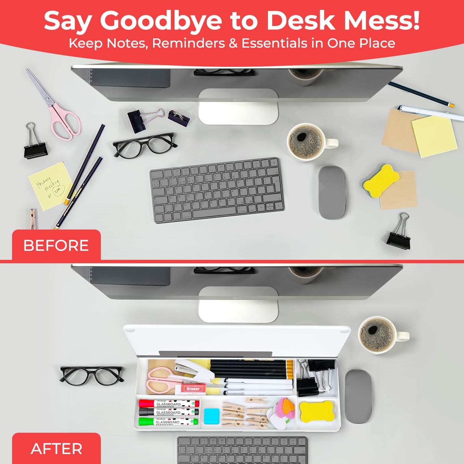 Chalkola Glass Desktop Whiteboard with Storage - Dry Erase Board, Work Desk Organizers, Computer Keyboard Stand, Home Office Desk Accessories, Small White Board, Workspace Desktop Buddy + 3 Markers