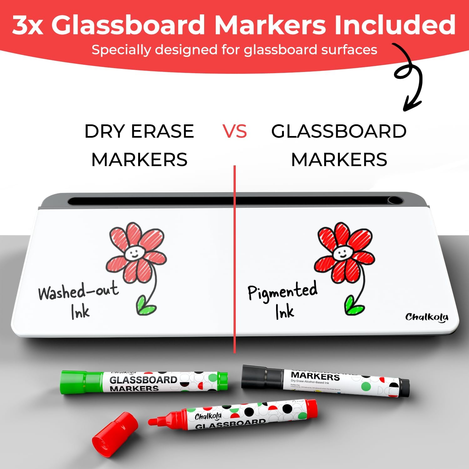 - COMPLETE SET WITH 3 GLASS MARKERS & ERASER - Vibrant markers (black, red, green) specially formulated for glass that write clearly and erase without residue. Compatible with standard dry erase markers too.