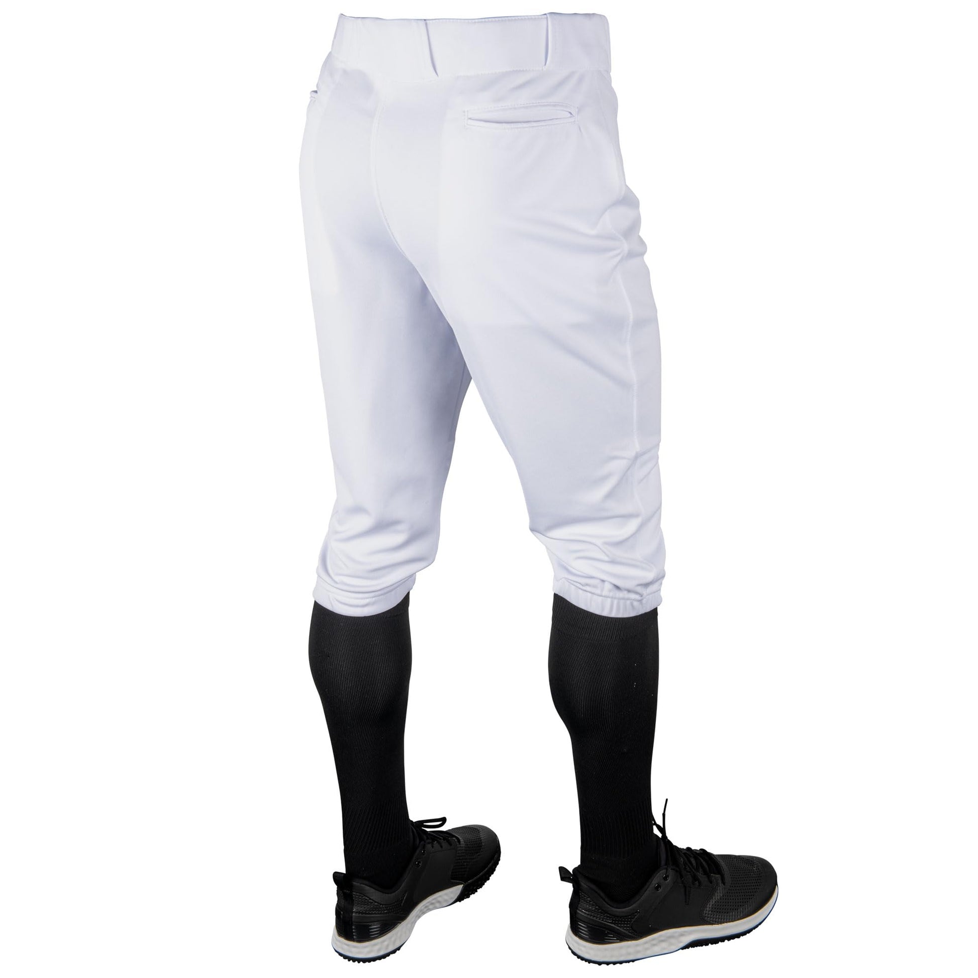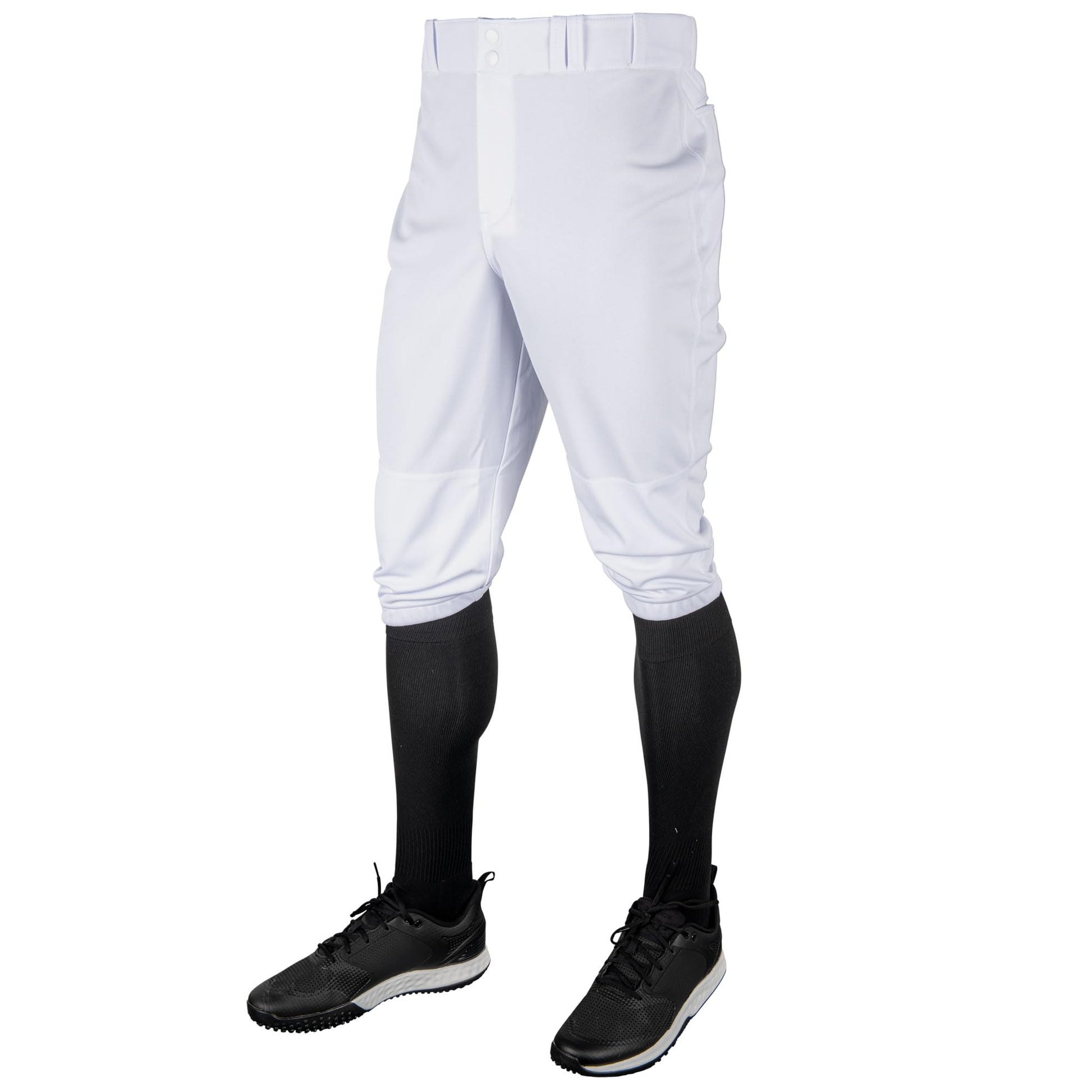 The CHAMPRO MVP Baseball Knicker is a modern knicker-style cut baseball pant. With elastic leg openings, knickers have a gentle but secure fit for a comfortable feel and easy movement throughout the game. Made of 100% abrasion-resistant polyester, the 12.5 oz. pro-weight fabric allows four-way stretch and adapts to the wearer’s movements. A 2.25" extra-wide elastic waistband with double snap closure and 7 pro-style tunnel belt loops keep the pants securely in place while maintaining comfort. The knees are reinforced with an extra layer of fabric to create a more durable pant that withstands the action and lasts longer through the season. Available in Adult sizes S-4XL and Youth sizes XS-XL in 3 solid colors with 2 inset back pockets.