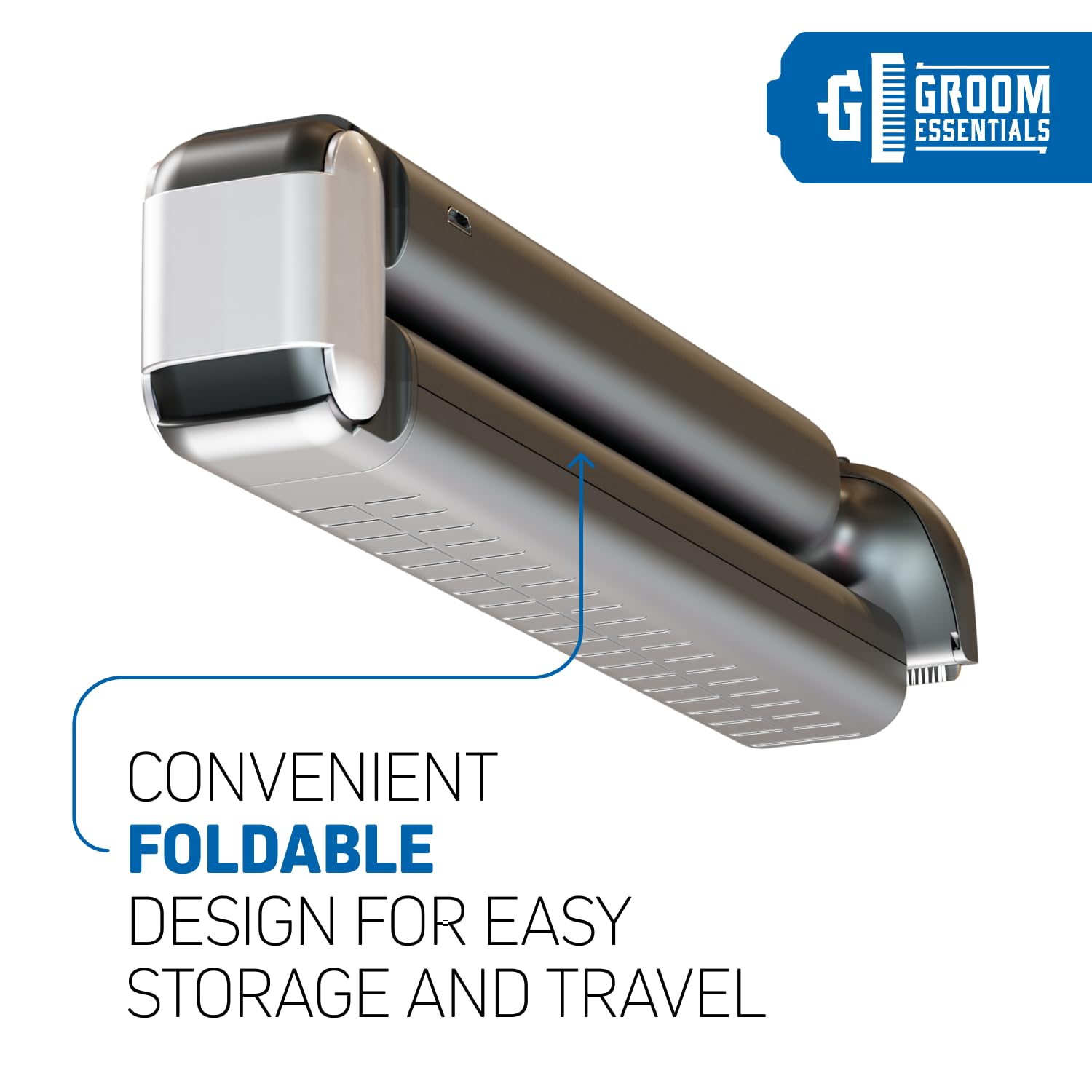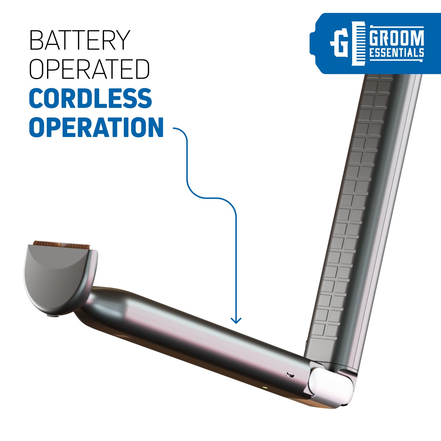 - Electric Back Shaver for Easy Grooming: The Groom Essentials Electric Back Shaver features a long, foldable arm that allows you to reach your back without needing the help of others. The shaver features an extendable handle, sharp stainless-steel blades, and an ergonomic grip for smooth maneuvering – engineered to tame the wild.