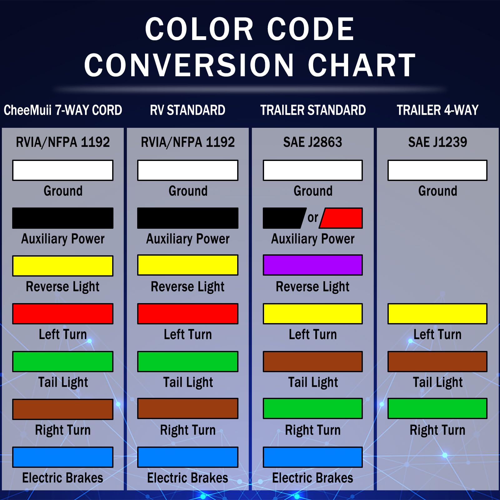 - DETAILED WIRING INSTRUCTION: CheeMuii trailer cords use 7 color-coded wires, and the color code adopted is suitable for most RV trailer wiring standards, but as there are some differences between trailer manufacturers, we have updated the detailed instructions, please read them carefully before use. Please refer to the wiring instructions and connect cables according to the color and function of the wires to avoid errors